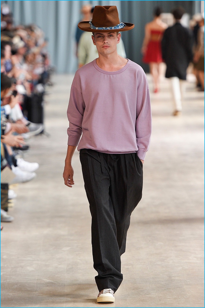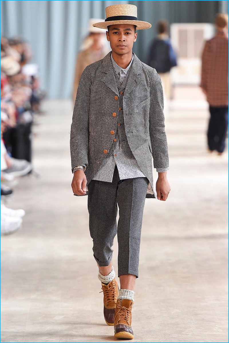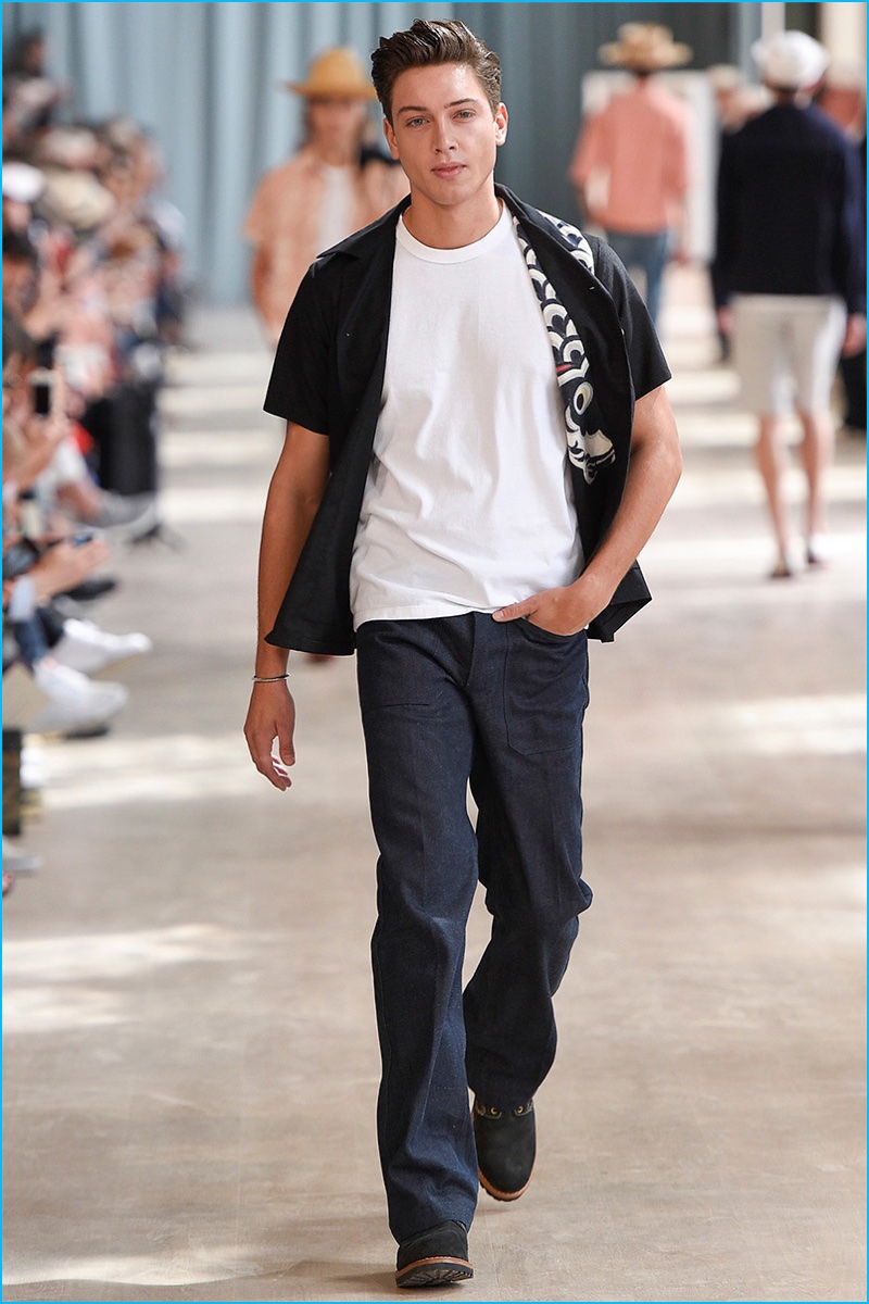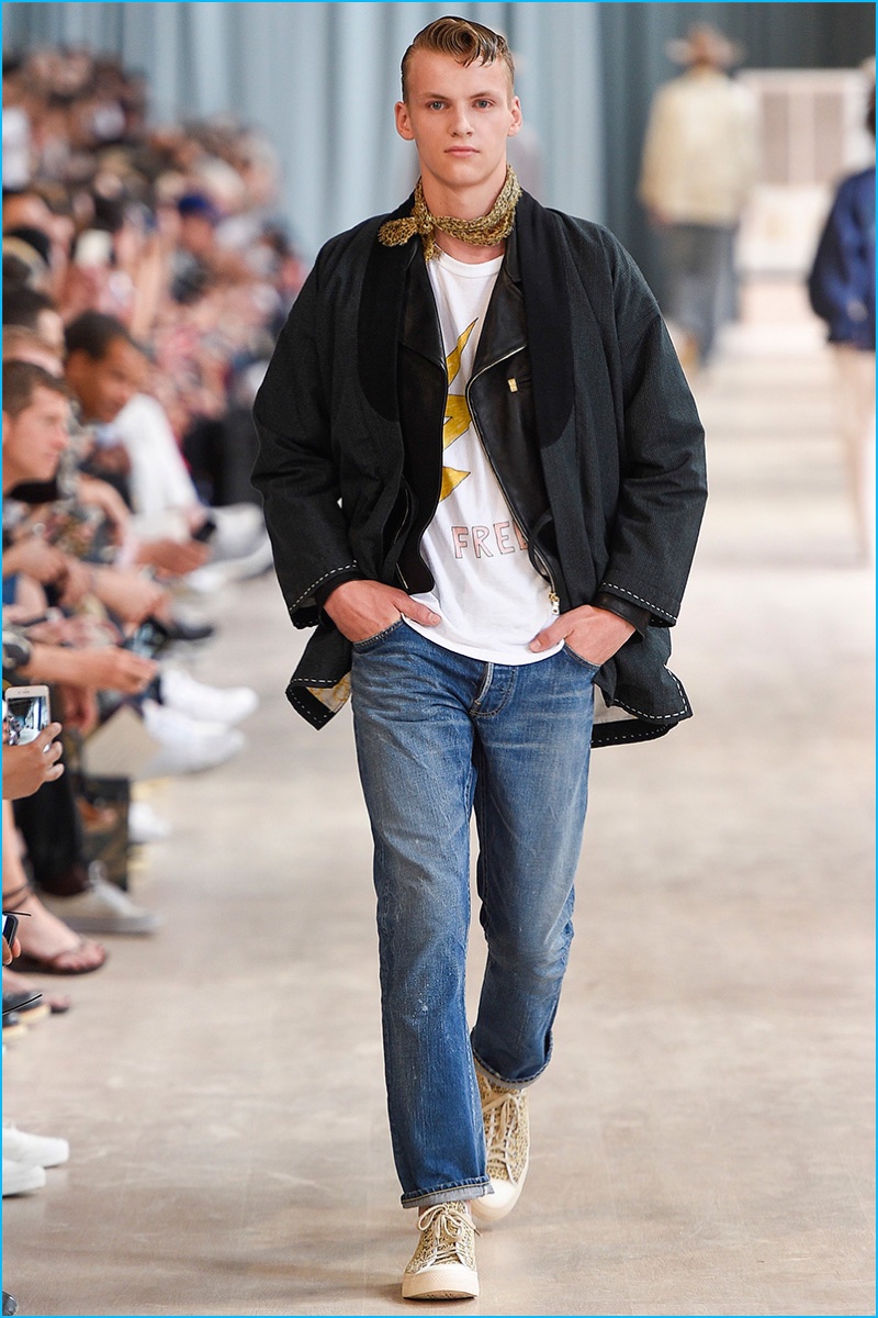 Visvim brought an everyday flair to the catwalk as the Japanese brand unveiled its spring-summer 2017 men’s collection during Pitti Uomo. Workwear inspired silhouettes boasted a collision of American and Japanese design motifs. Visvim designer Hiroki Nakamura presented wearable fashions with a bevy of essential looks. Graphic t-shirts, distressed denim jeans, short-sleeve shirts, shawl neck collar coats and biker jackets contributed to the easy lineup. Contrasting both tailored and laid-back ensembles, Visvim brought a country flair to three-piece suits, while also championing the ultimate ease of oversized sweatshirts.