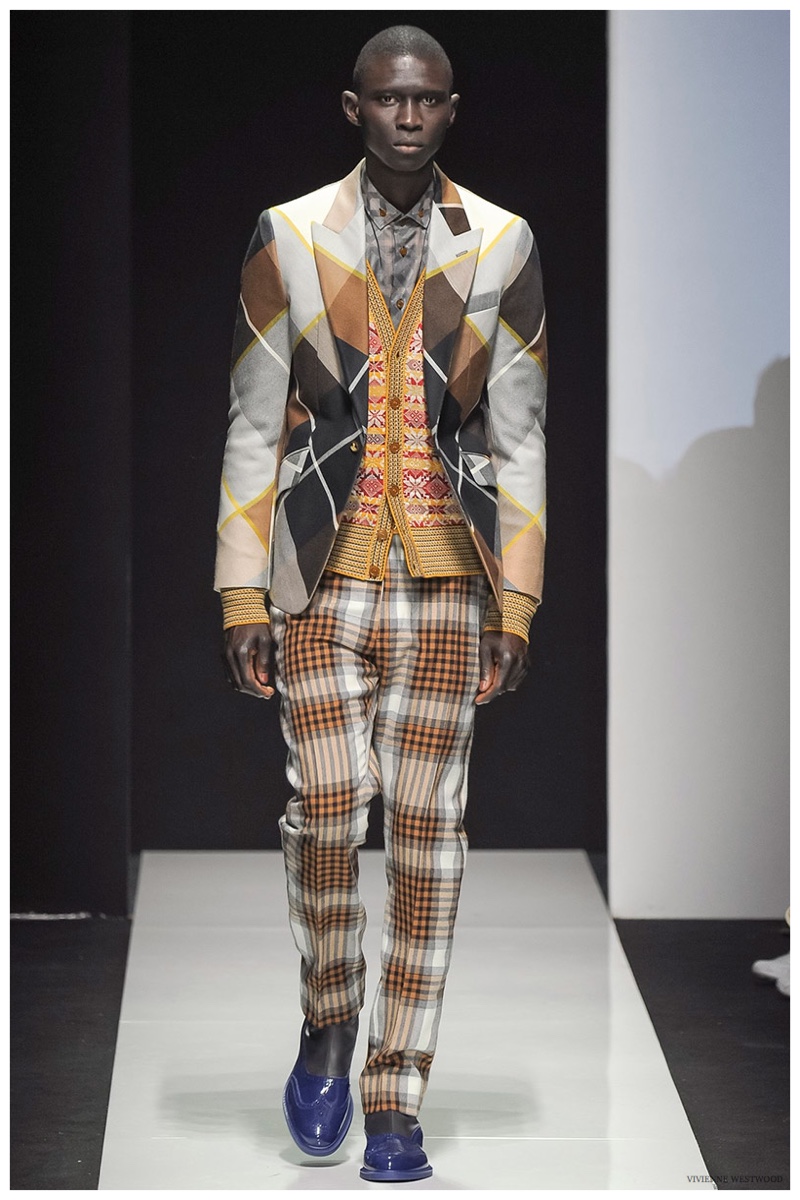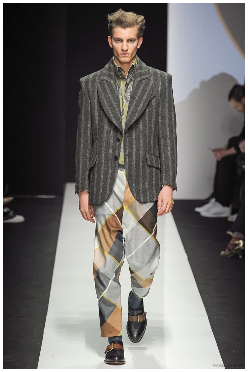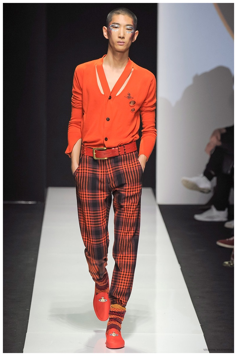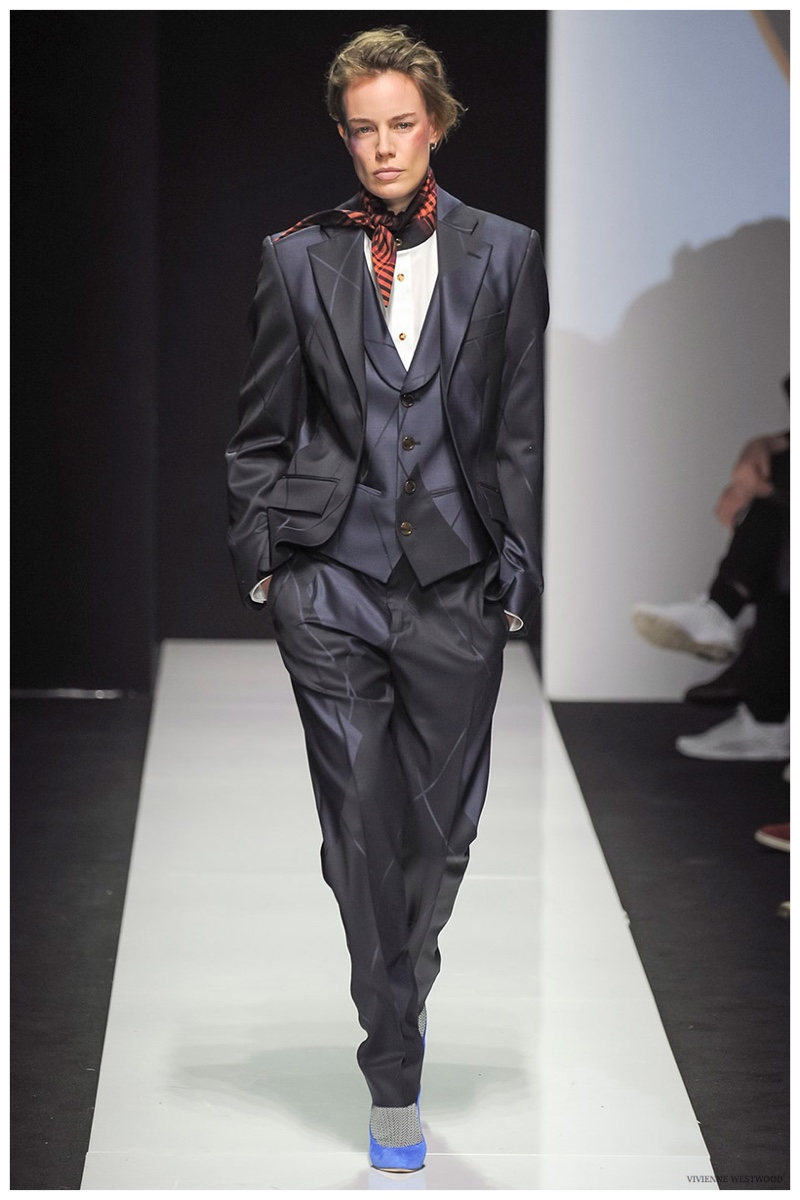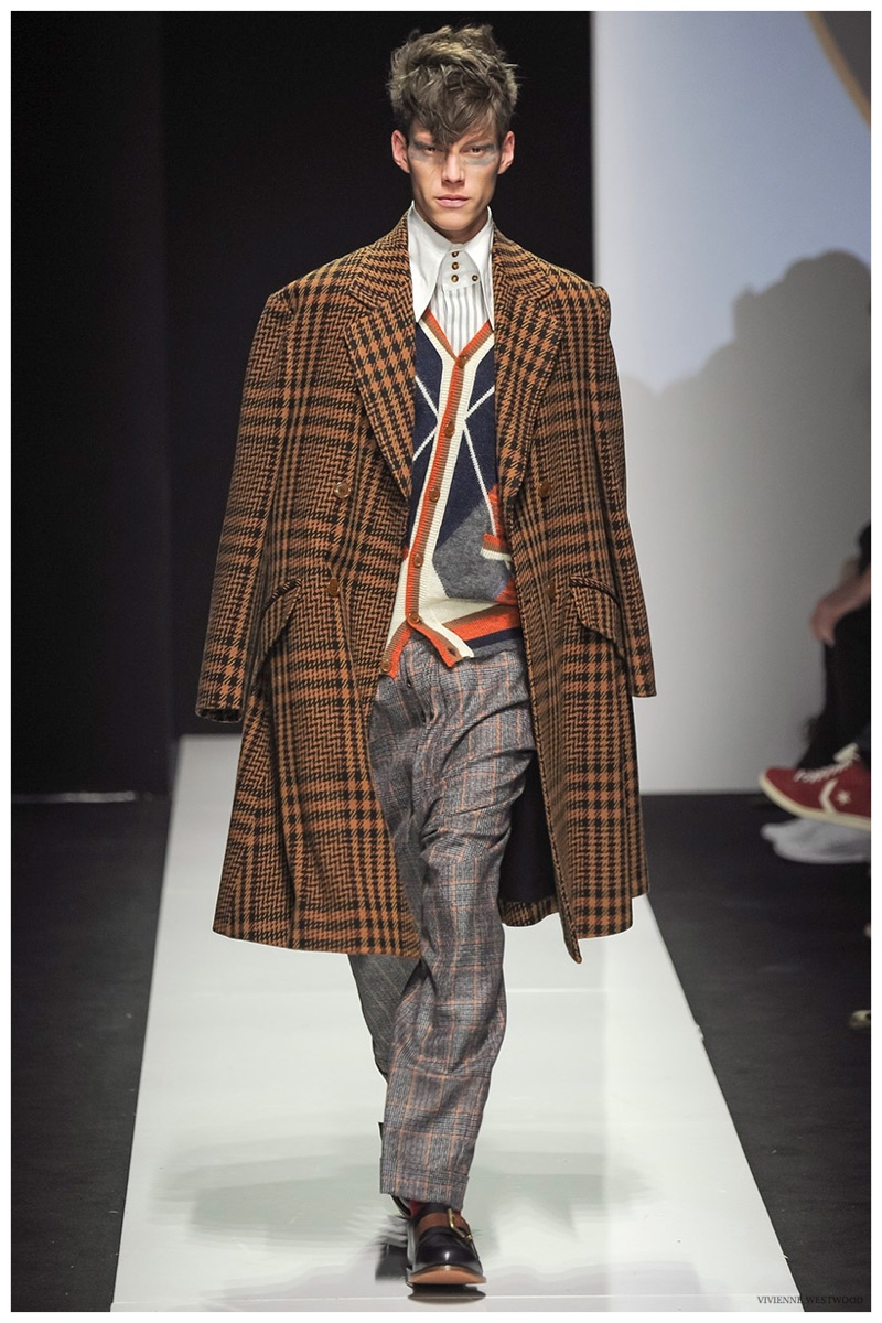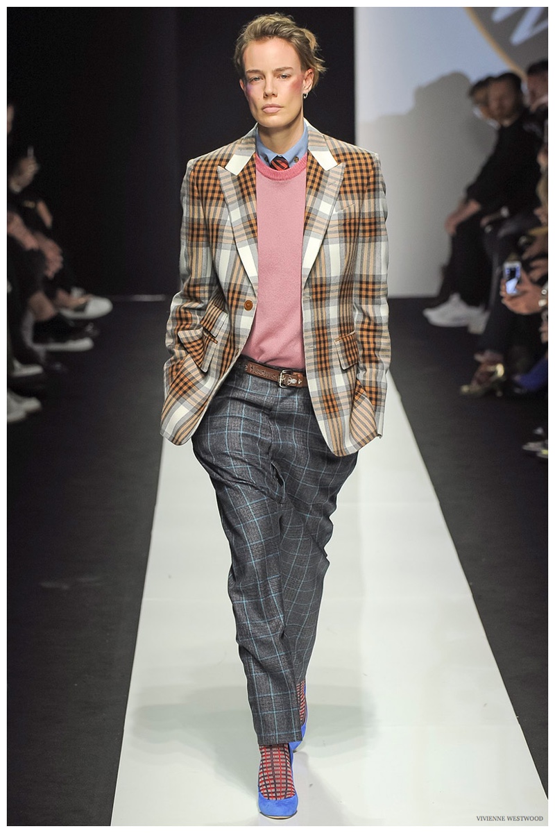Sending both male and female models down the catwalk, Vivienne Westwood made a statement on gender neutrality with her latest outing. Tailoring and soft knitwear were the focal points for the season as theatrics were incorporated into lively prints. Always displaying a sense of humor, the fashions may have had a dandy spin, but the finishes were lighthearted. Plaids and houndstooth were of a graphic quality like they were lifted from a comic book while checks and jacquards were set askew. Layered with an urban finesse, knitwear and sporty separates added a fun spontaneity to a stellar lineup.