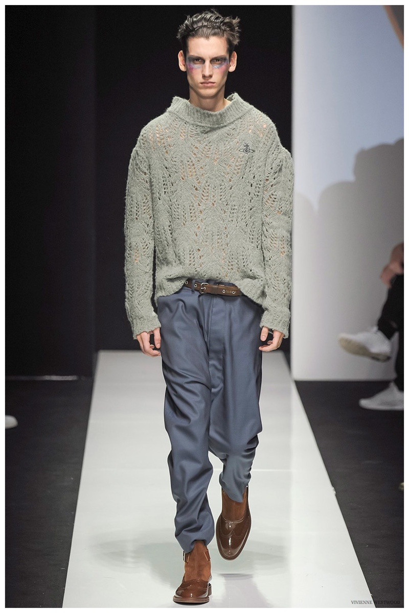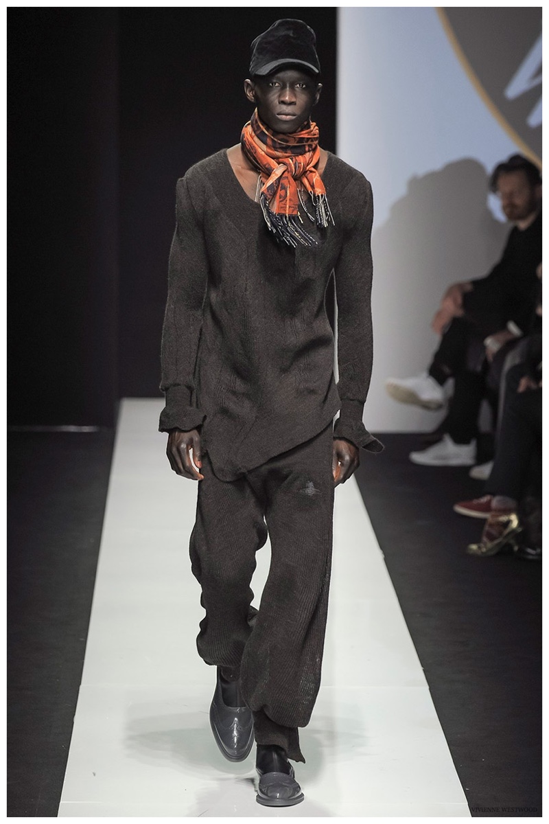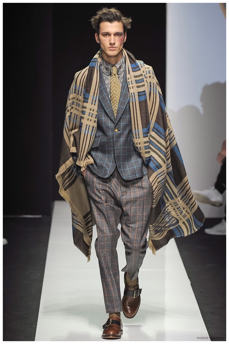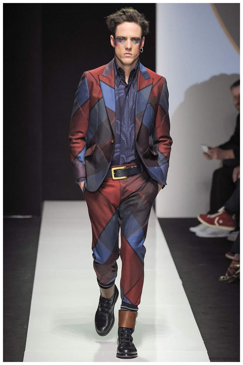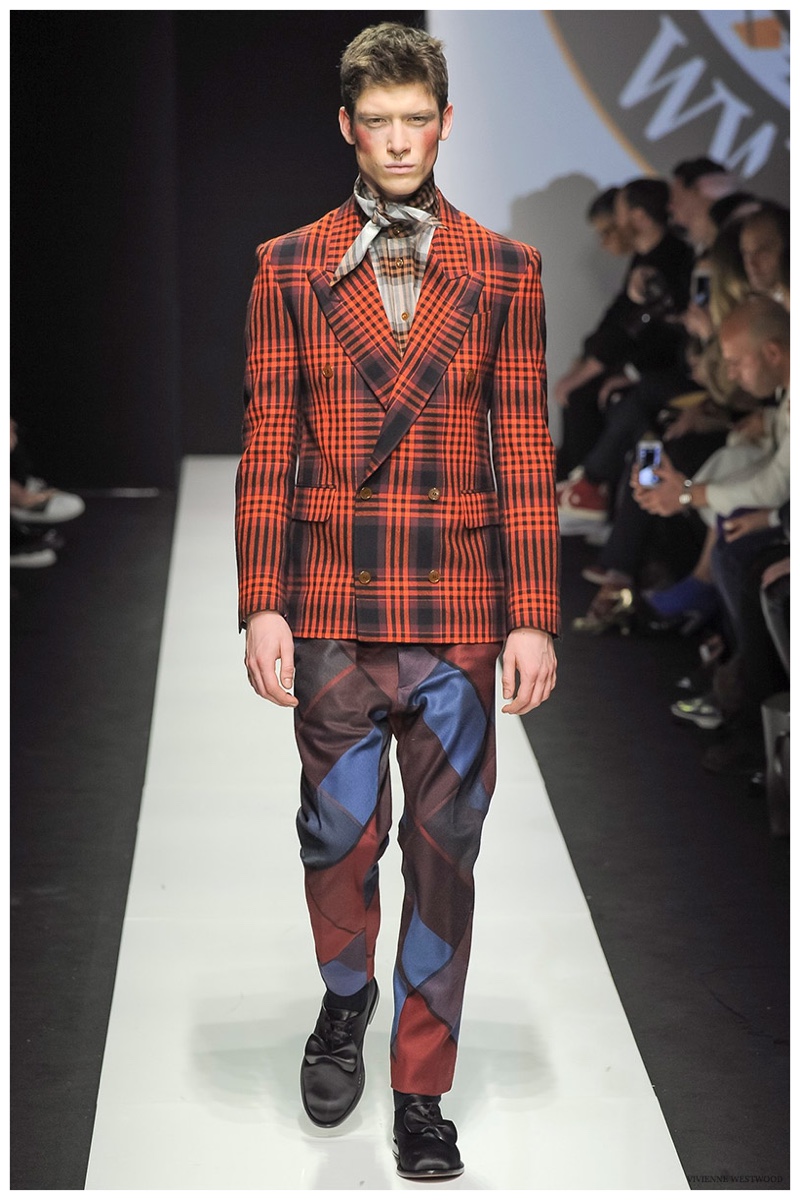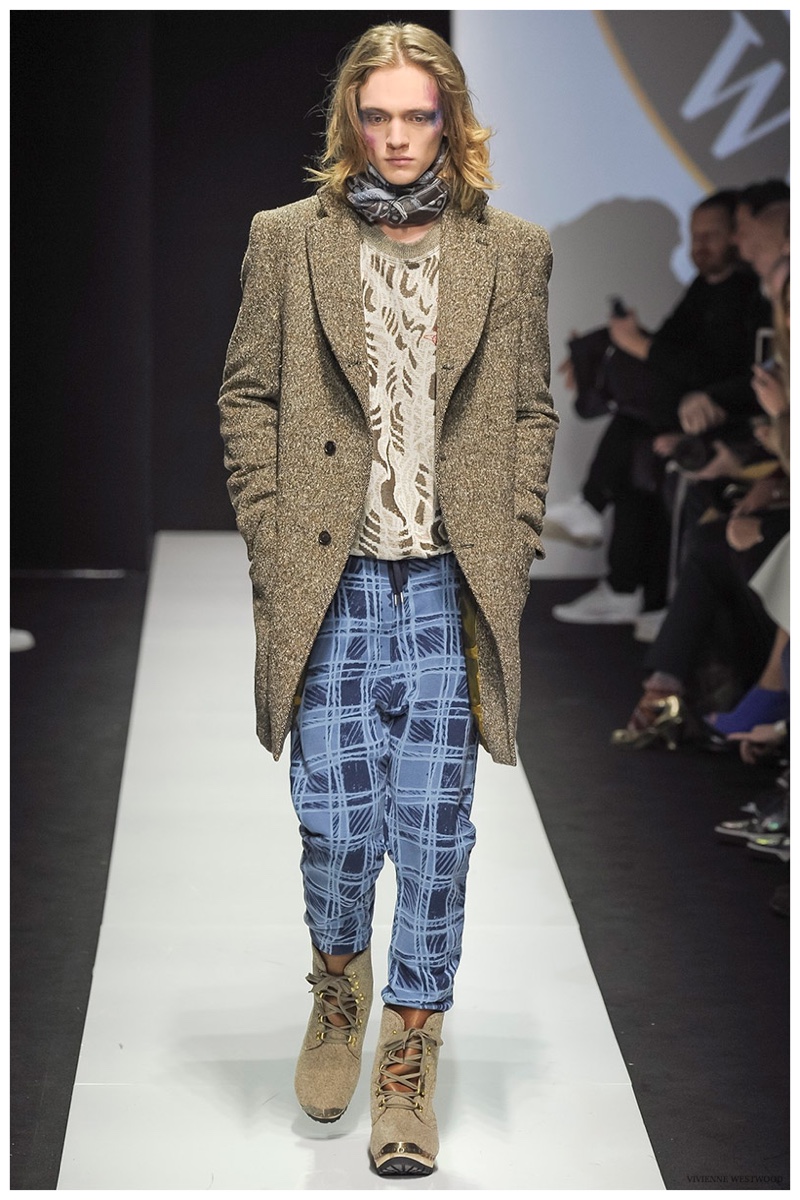 Sending both male and female models down the catwalk, Vivienne Westwood made a statement on gender neutrality with her latest outing. Tailoring and soft knitwear were the focal points for the season as theatrics were incorporated into lively prints. Always displaying a sense of humor, the fashions may have had a dandy spin, but the finishes were lighthearted. Plaids and houndstooth were of a graphic quality like they were lifted from a comic book while checks and jacquards were set askew. Layered with an urban finesse, knitwear and sporty separates added a fun spontaneity to a stellar lineup.