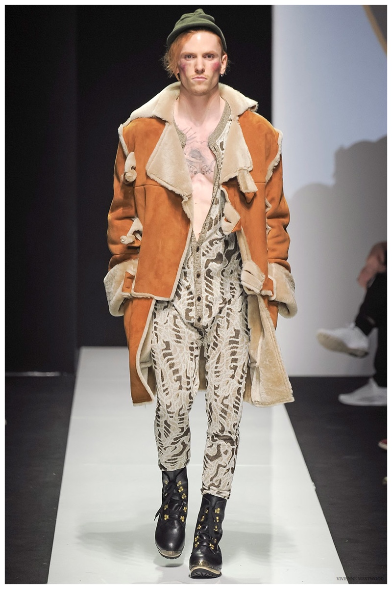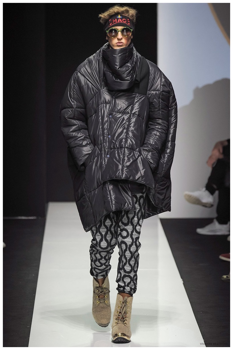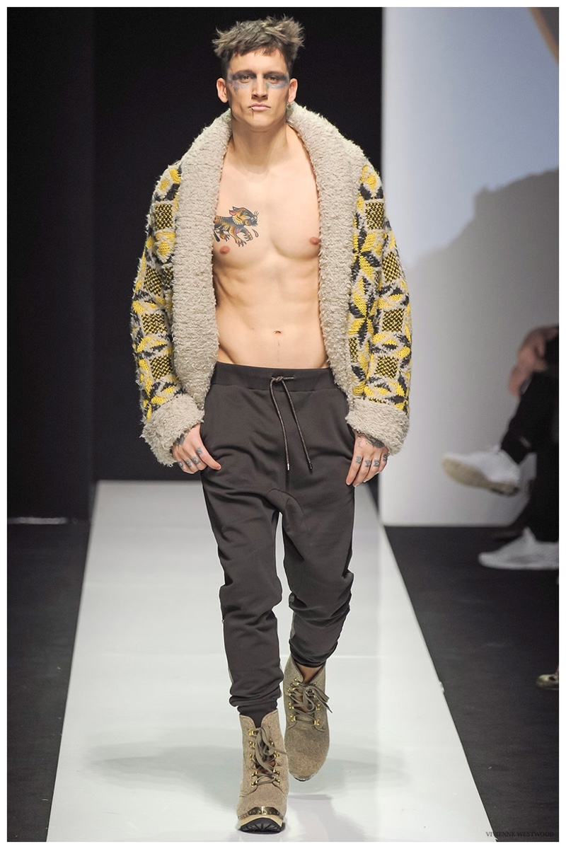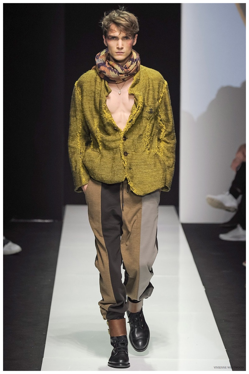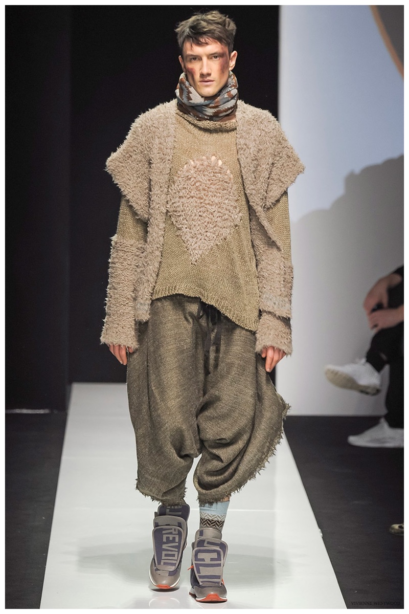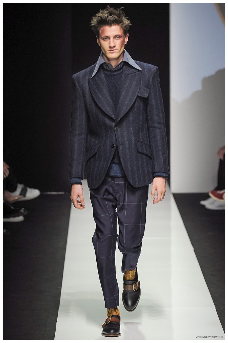 Sending both male and female models down the catwalk, Vivienne Westwood made a statement on gender neutrality with her latest outing. Tailoring and soft knitwear were the focal points for the season as theatrics were incorporated into lively prints. Always displaying a sense of humor, the fashions may have had a dandy spin, but the finishes were lighthearted. Plaids and houndstooth were of a graphic quality like they were lifted from a comic book while checks and jacquards were set askew. Layered with an urban finesse, knitwear and sporty separates added a fun spontaneity to a stellar lineup.