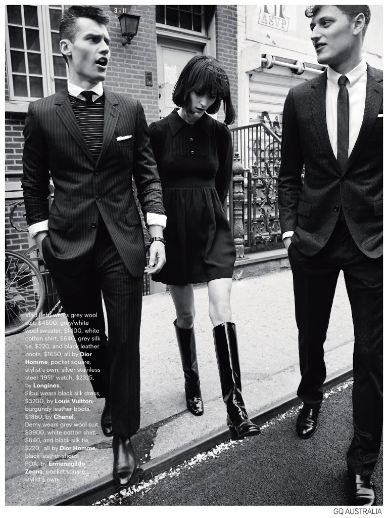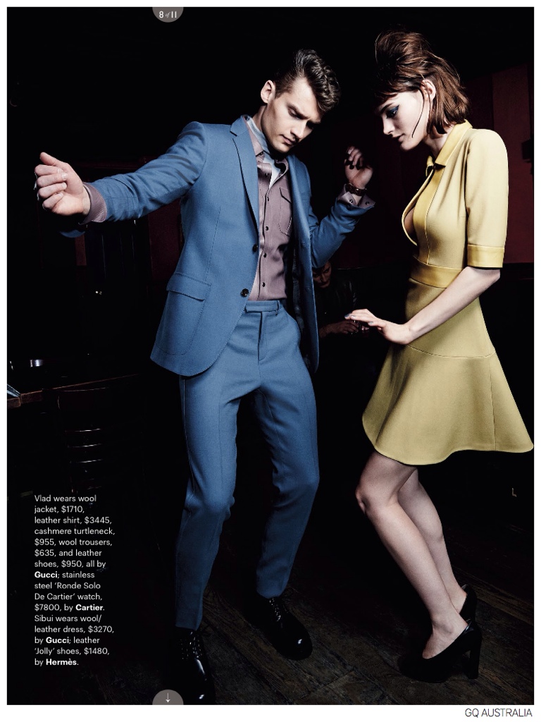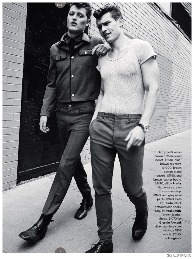 60’s Reimagined-Models Vladimir Ivanov and Demy Matzen take on 60’s-inspired fashions for the September 2014 issue of GQ Australia. Posing for Pamela Hanson’s lens in looks from Gucci, Prada, Paul Smith and others, the models update the aesthetic of this charming decade with sleek silhouettes, luxurious ensembles and rich plain colors, selected by stylist Wayne Gross. Heading to the Big Apple for the shooting, Vladimir and Demy enjoy a stroll in the streets wearing casual pieces, or prefer a moment of fun, dancing with a charming brunette wearing their party wardrobe. / Hair by Kenshin Asano. Makeup by Rie Omoto.