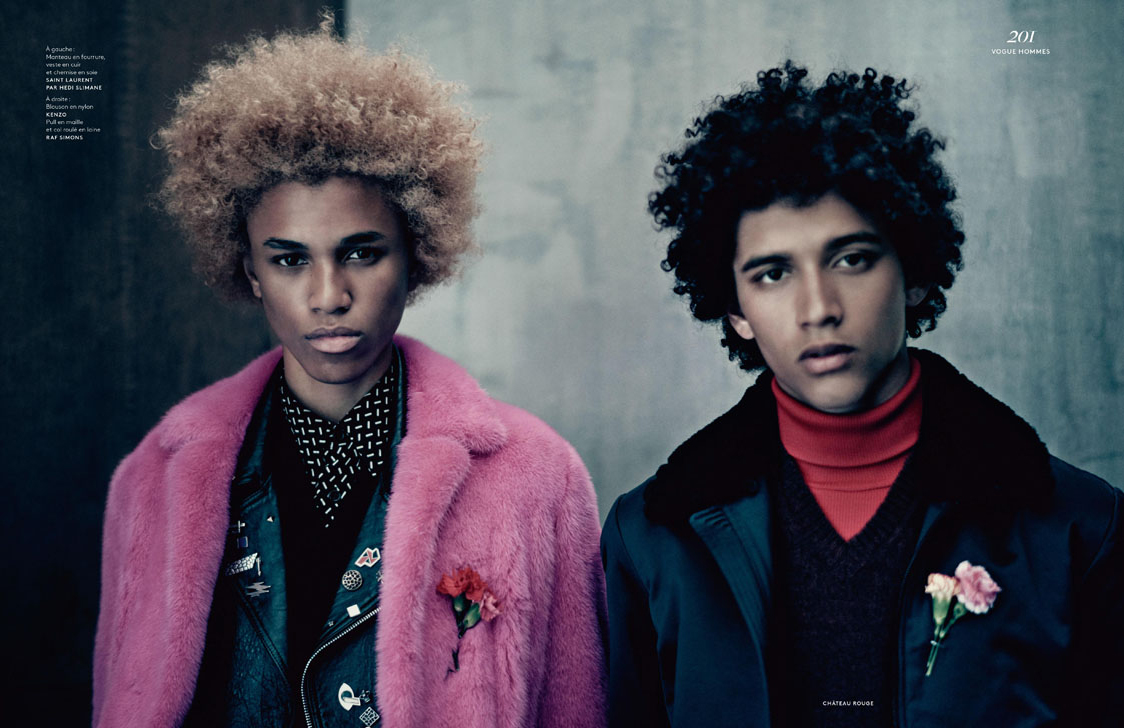 Model Michael Lockley in Saint Laurent and Jackson Hale in Kenzo and Raf Simons for Vogue Hommes Paris.