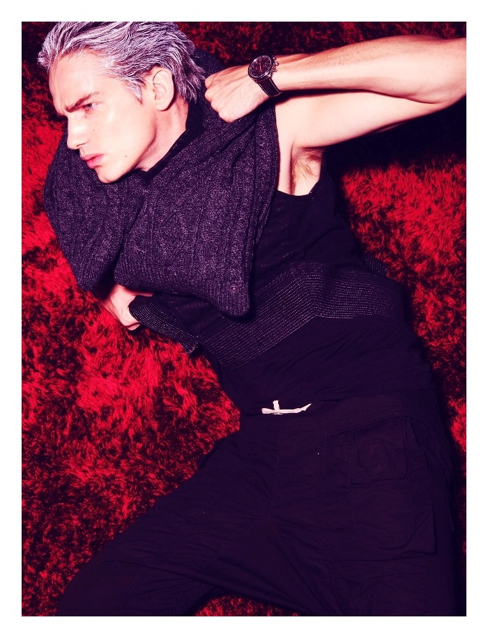 Casual Luxe–Upfront model Walmir Birchler seduces the camera in his latest spread with Micky Wong for Designare Homme. Styled by Jumius Wong, Walmir takes on a mix of alluring casual fall looks, featuring tweed blazers, knitwear and dashing accessories as he poses against an alluring crimson backdrop. / Grooming by Ark Lin.