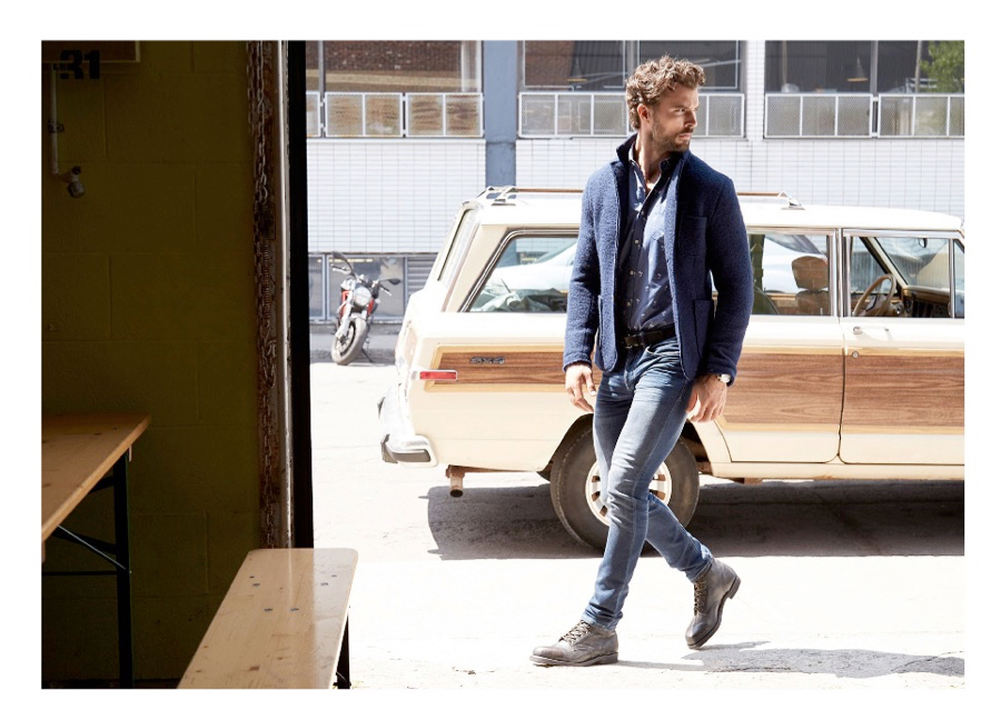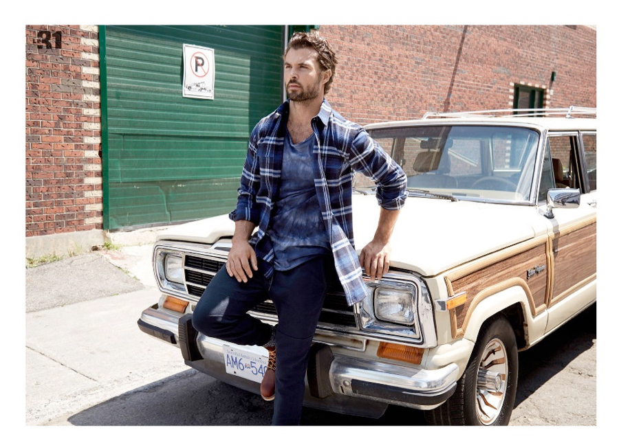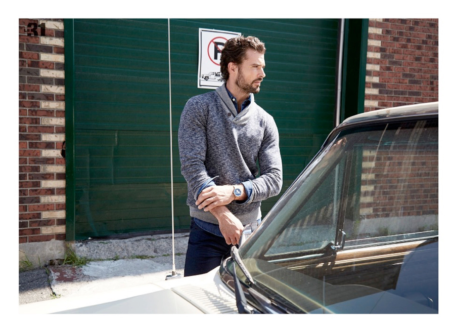Fall is undoubtedly in session when it comes to Simons. The retailer keeps up the momentum of the new season with a shoot featuring model Walter Savage. Following a designer offering, modeled by Lucky Blue Smith, Simons goes casual. Pictured, Walter embraces a blue color palette as he mixes timeless separates. Walter’s wardrobe of must-haves include the shawl neck sweater, denim jeans, hooded pullovers and relaxed button-downs.
