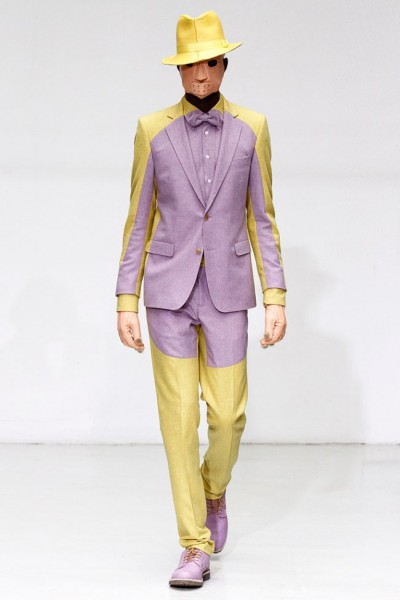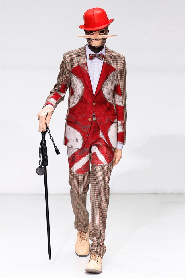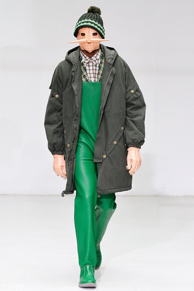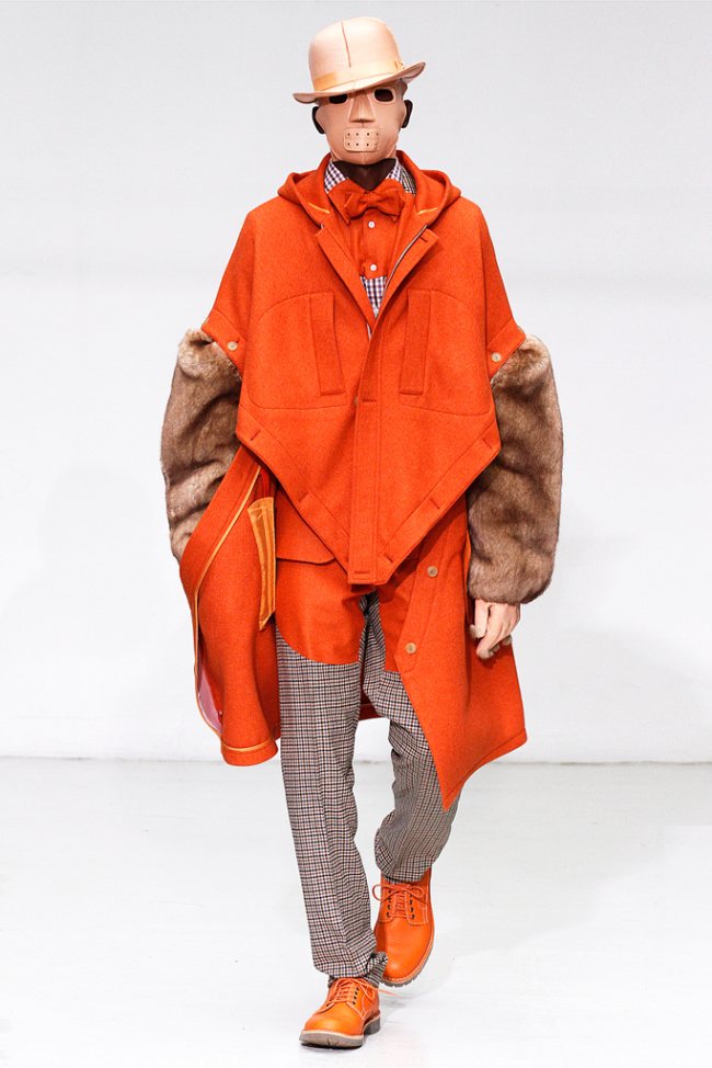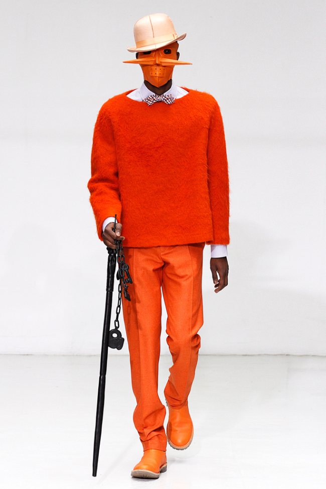 Doll for the Day–Not one for the status quo, Walter Van Beirendonck took his men on a wild ride for the fall/winter 2012 season. Laced with his tendency for plaid and vibrant colors, a masked figure emerged dressed in garments that took a roaming exploration of the silhouette. From fitted and loose to billowing, Van Beirendonck created a visual buffet. Infusing the colorful lineup with geometric work, a conservative application of suiting became eccentric. Dissecting knits and outerwear with varying parts and color blocking, the collection eventually came together with an organized state of sartorial chaos serving well.