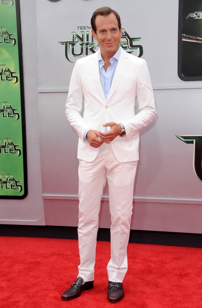 Arnett in Ferragamo-Attending the Los Angeles premiere of his latest movie, ‘Teenage Mutant Ninja Turtles’, actor and comedian Will Arnett changed things up for the red carpet, bucking the dark suit trend and settling for a white summer look. Wearing a white linen suit from Italian label Salvatore Ferragamo, Arnett completed his look with leather loafers and a light blue shirt.