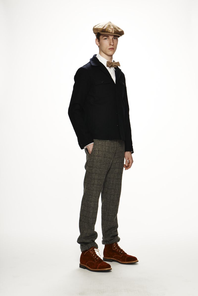 Motorstyle–Woolrich Woolen Mills reveals their fall/winter 2013 collection during the course of Milan Fashion Week, once again recruiting model David Hlinka for the season’s lookbook. Designer Mark McNairy’s fifth outing for the season, the new collection is inspired by vintage motor sports, reinterpreting garments of the 1930’s and 40’s, utilizing heritage Woolrich prints and fabrics. With the collection made entirely in the USA, wool prints and vintage tweeds represent a dapper aesthetic fused with a rugged energy. Two-piece suits are cut from wool and tweed, while accessories charm with a throwback to 1930’s essentials, ranging from bow-ties and braces to newsboy caps. Honing in on outerwear, the striped poncho and peacoat are fall’s standouts with timeless Woolrich pieces making the modern grade.