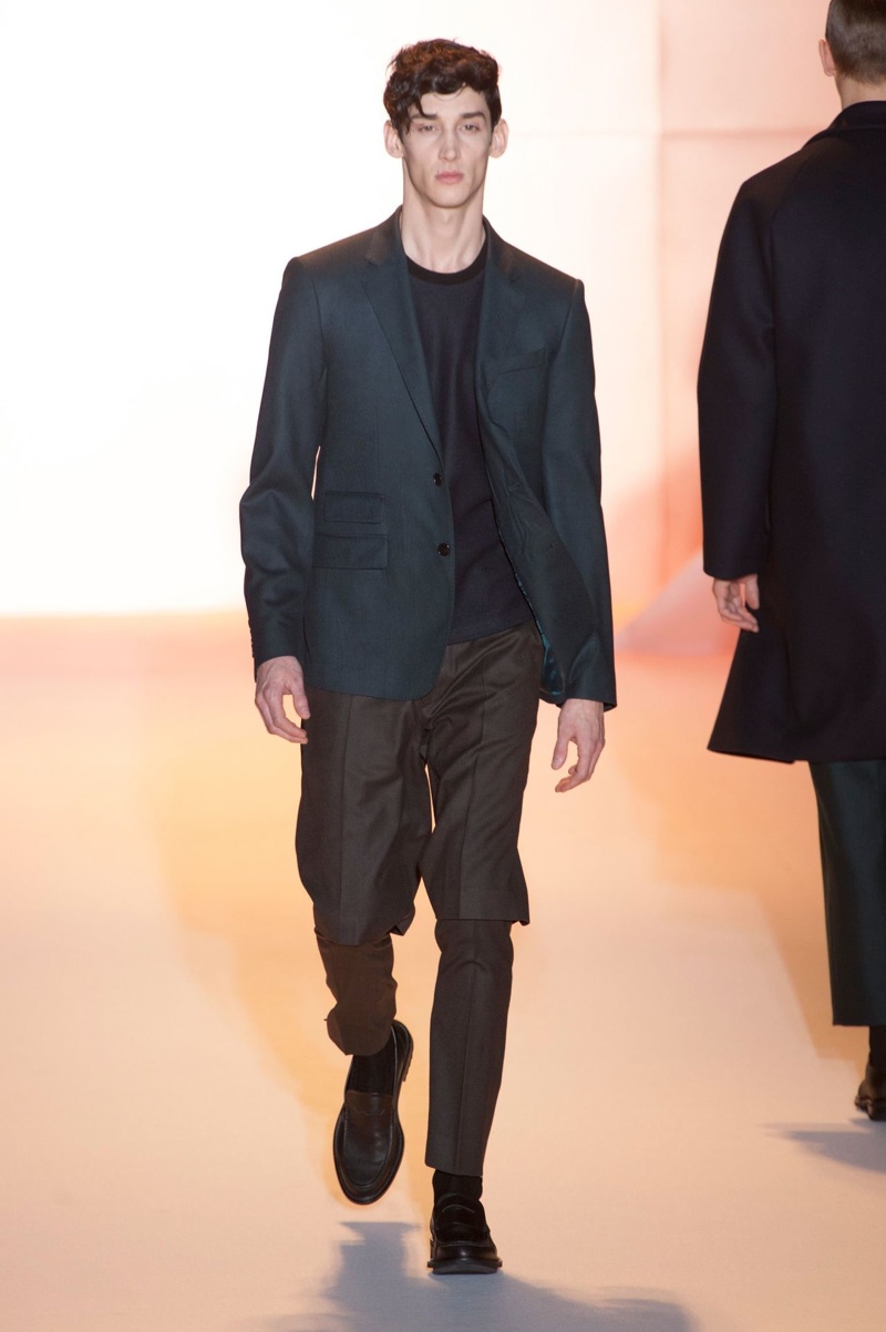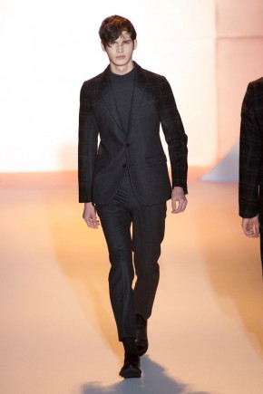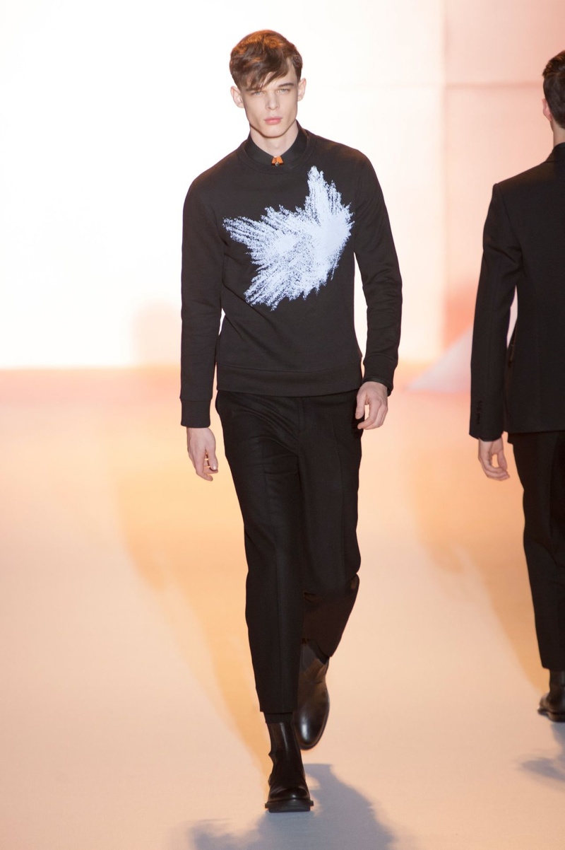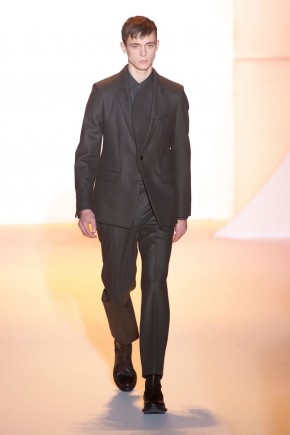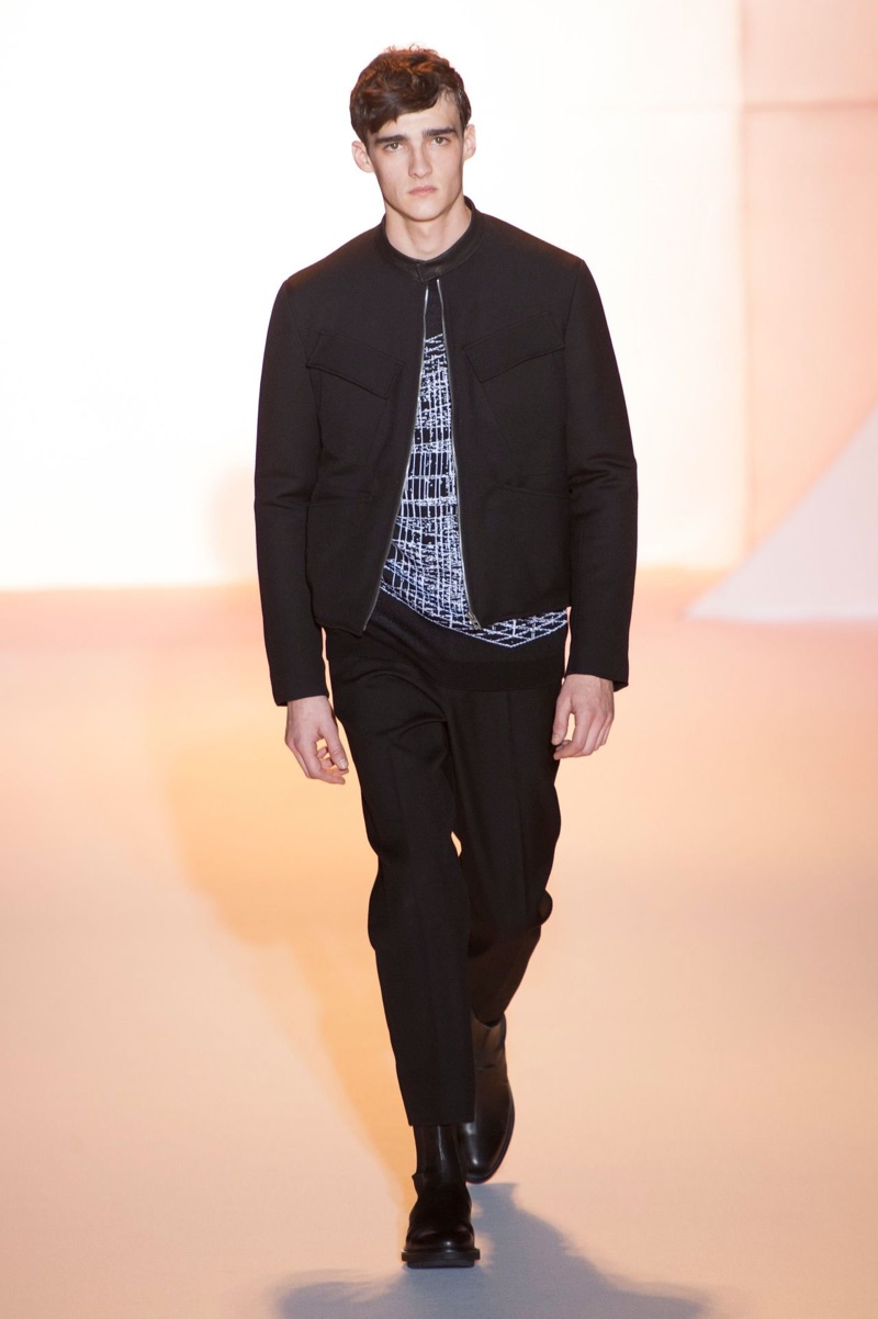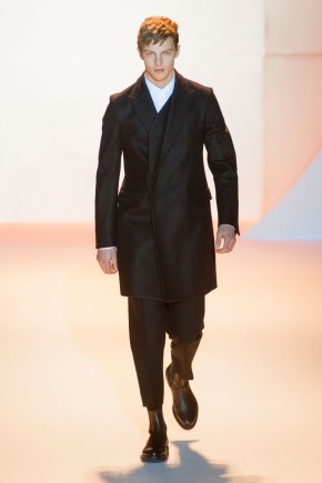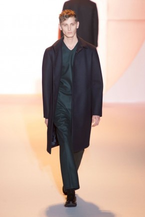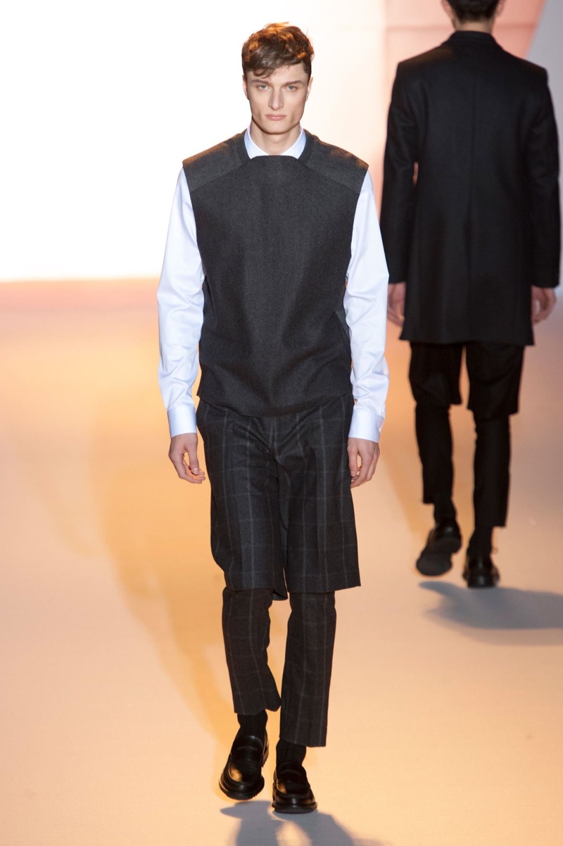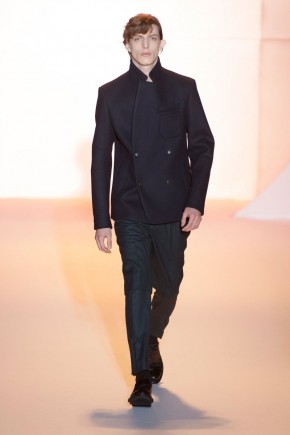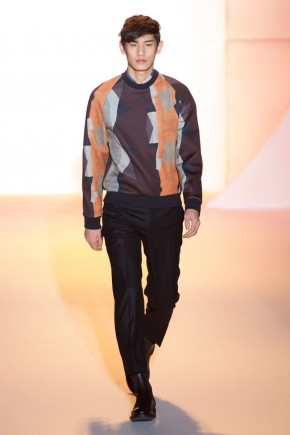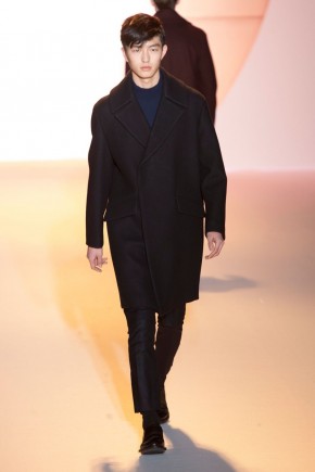 Wooyoungmi Fall/Winter 2014–Having a lunar eclipse of sorts, Wooyoungmi rounded hems this season as relaxed suiting gave way to a confident man of style. Making crisp graphic statements, white dress shirts featured shapes such as a crescent moon. Suiting shorts worn over trousers joined sweatshirts and cardigans. Window pane prints and plaids were executed in tonal hues. The pinstripe suit was reinterpreted as a jumpsuit or a tailored top reminiscent of a suit jacket.