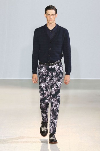 Like a Boy–Wooyoungmi had a cheeky, youthful quality to their spring/summer 2013 collection. The looks were simple and the cuts relaxed but the heart of the range joyous. Weaving colorful prints and a floral motif into the collection, the season was afforded some nonchalant fun. Outside jackets and slim trousers, the denim jacket was reinterpreted with a subtle print and suiting shorts made the smart transition as well. Paired with loafers and plenty of leather accessories, Wooyoungmi played the concise card this season, maintaining their slim lines with a touch of whimsy.