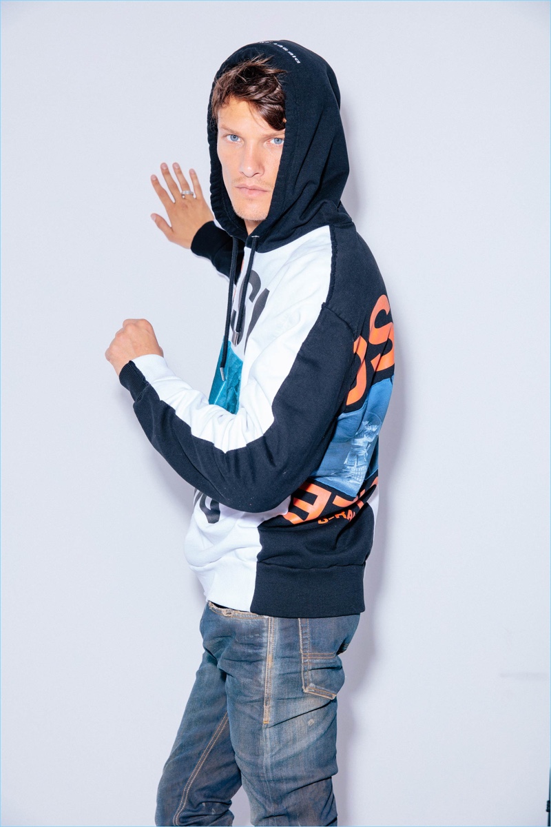 The current face of Wormland’s fall-winter 2018 campaign, model Danny Beauchamp reunites with the retailer to mark exciting news. Wormland collaborates with Diesel on an exclusive collection to celebrate the brand’s 40th anniversary. Embracing Diesel’s timely cool, Danny rocks pieces from the bold collection. The lineup includes everything from laid-back joggers to a throwback hoodie and embellished jeans.