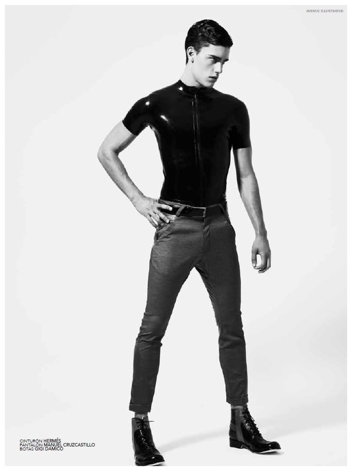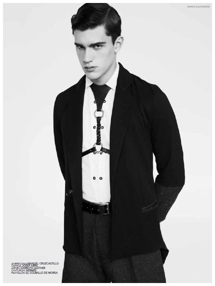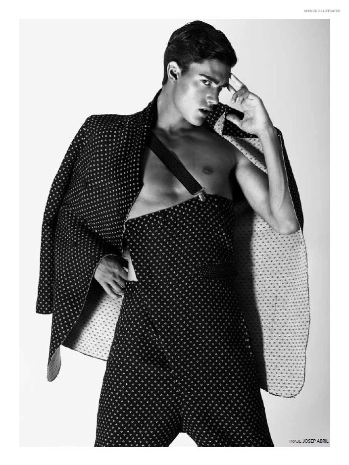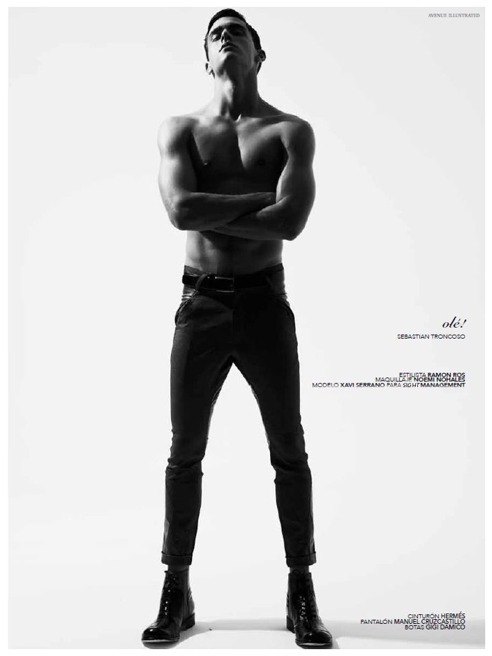 One of Dolce & Gabbana’s latest campaign stars, Sight Management Studio model Xavier Serrano graces the pages of Spanish magazine Avenue Illustrated. Starring in a black & white fashion spread lensed by Sebastian Troncoso, Xavier models bold bondage themed styles. / Styling by Ramon Ros.