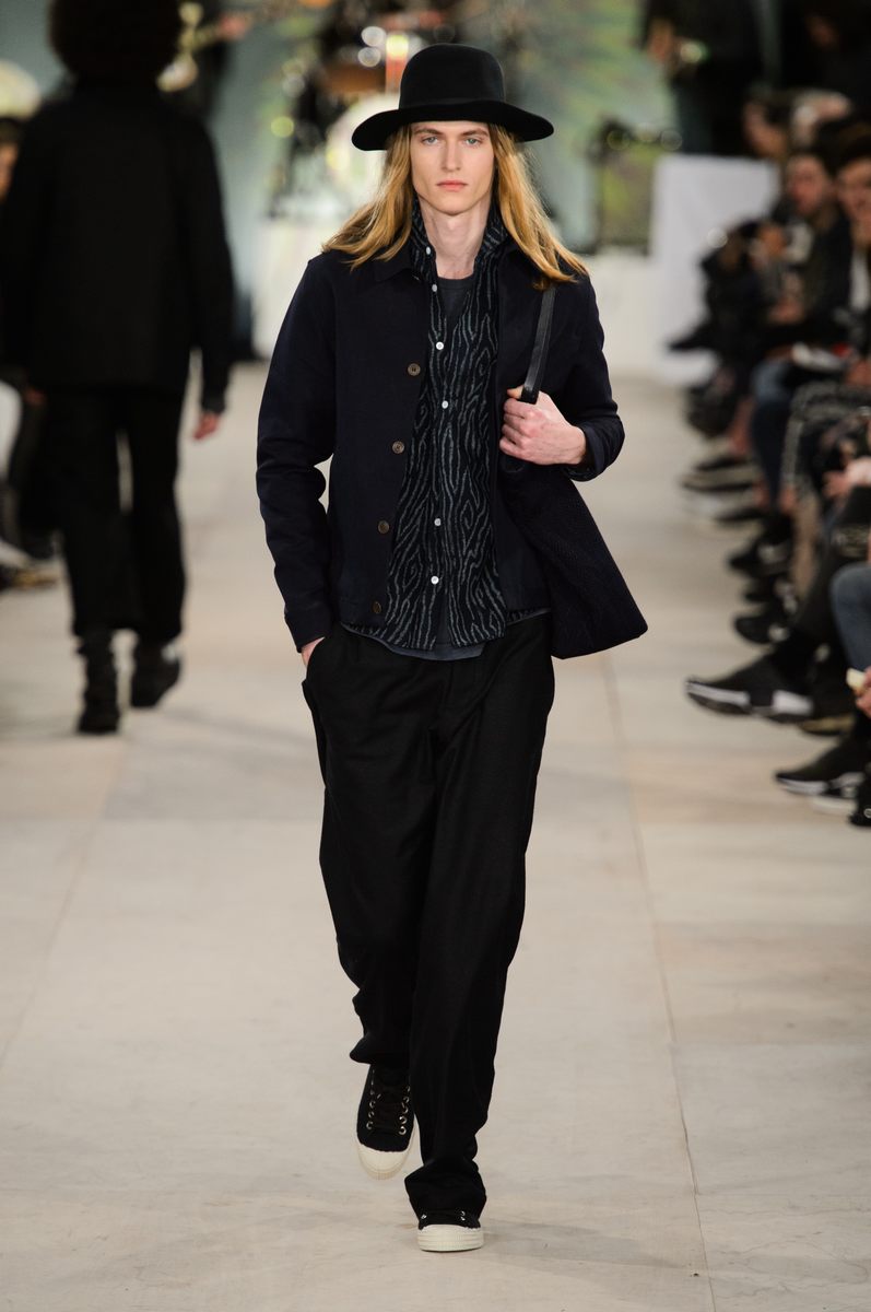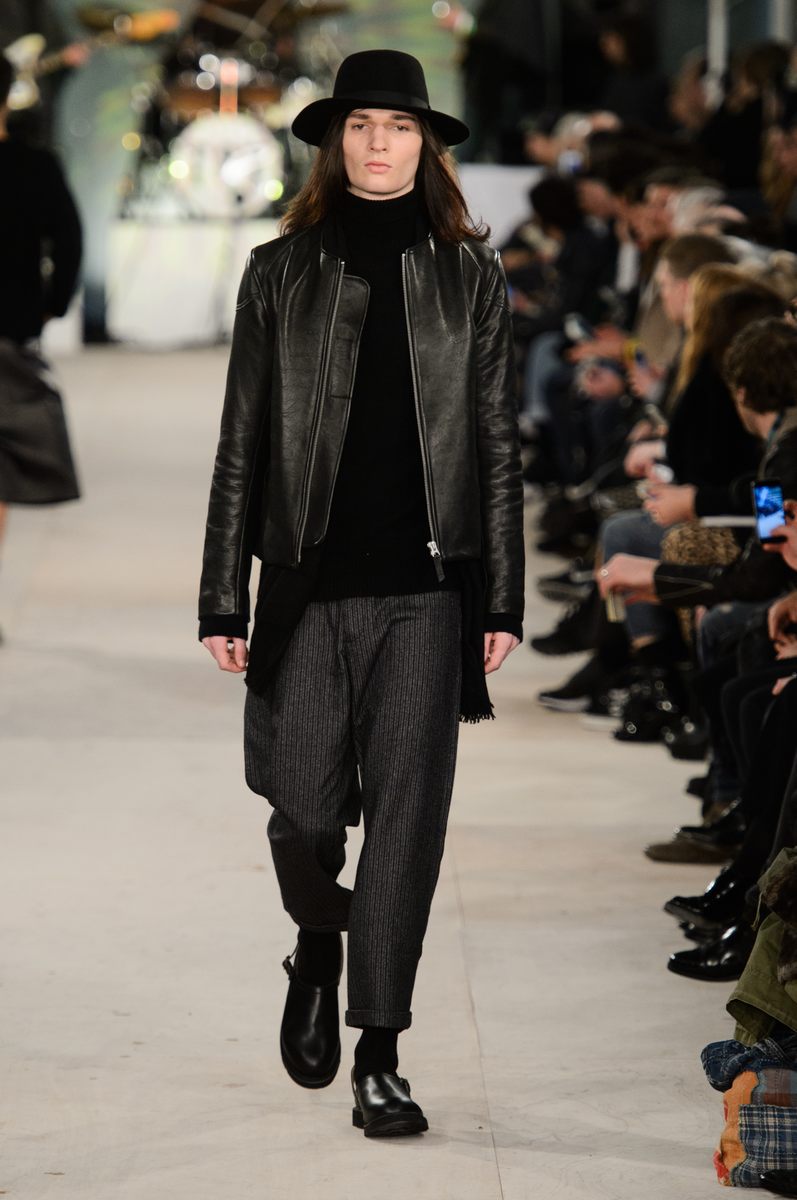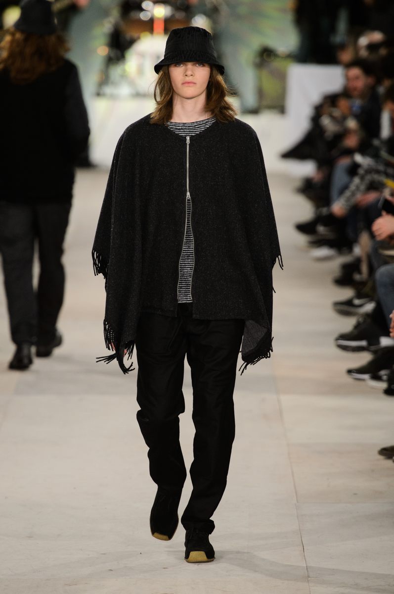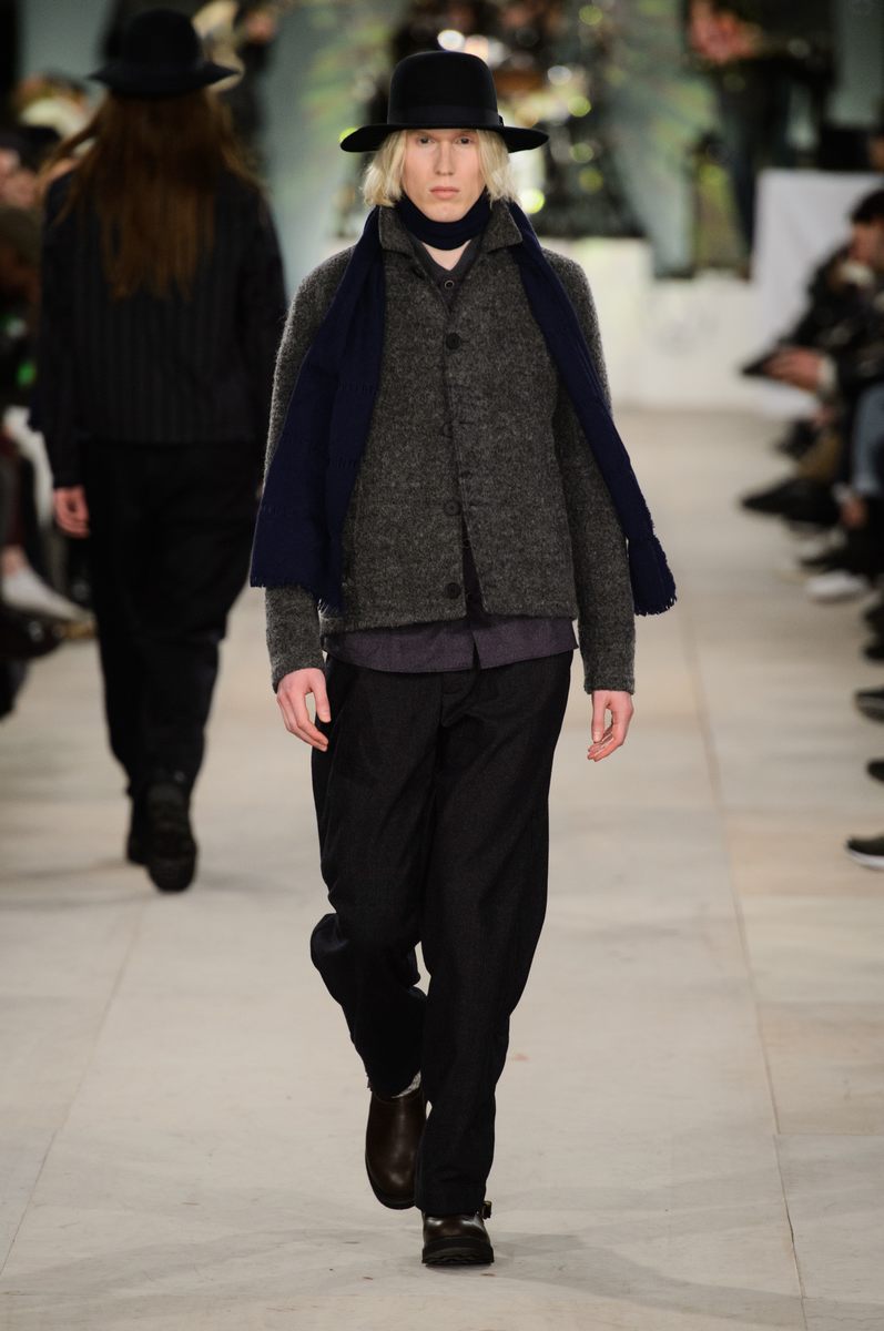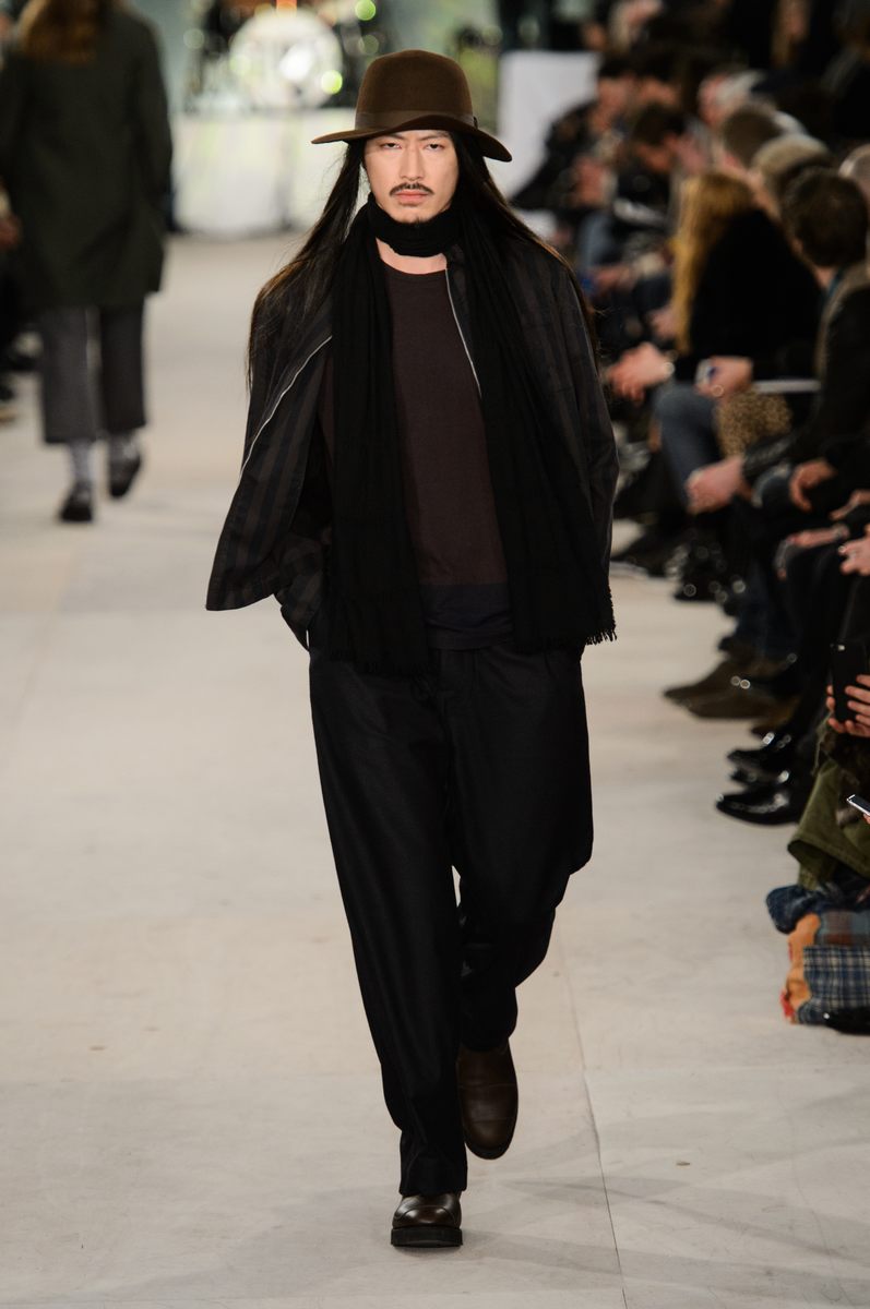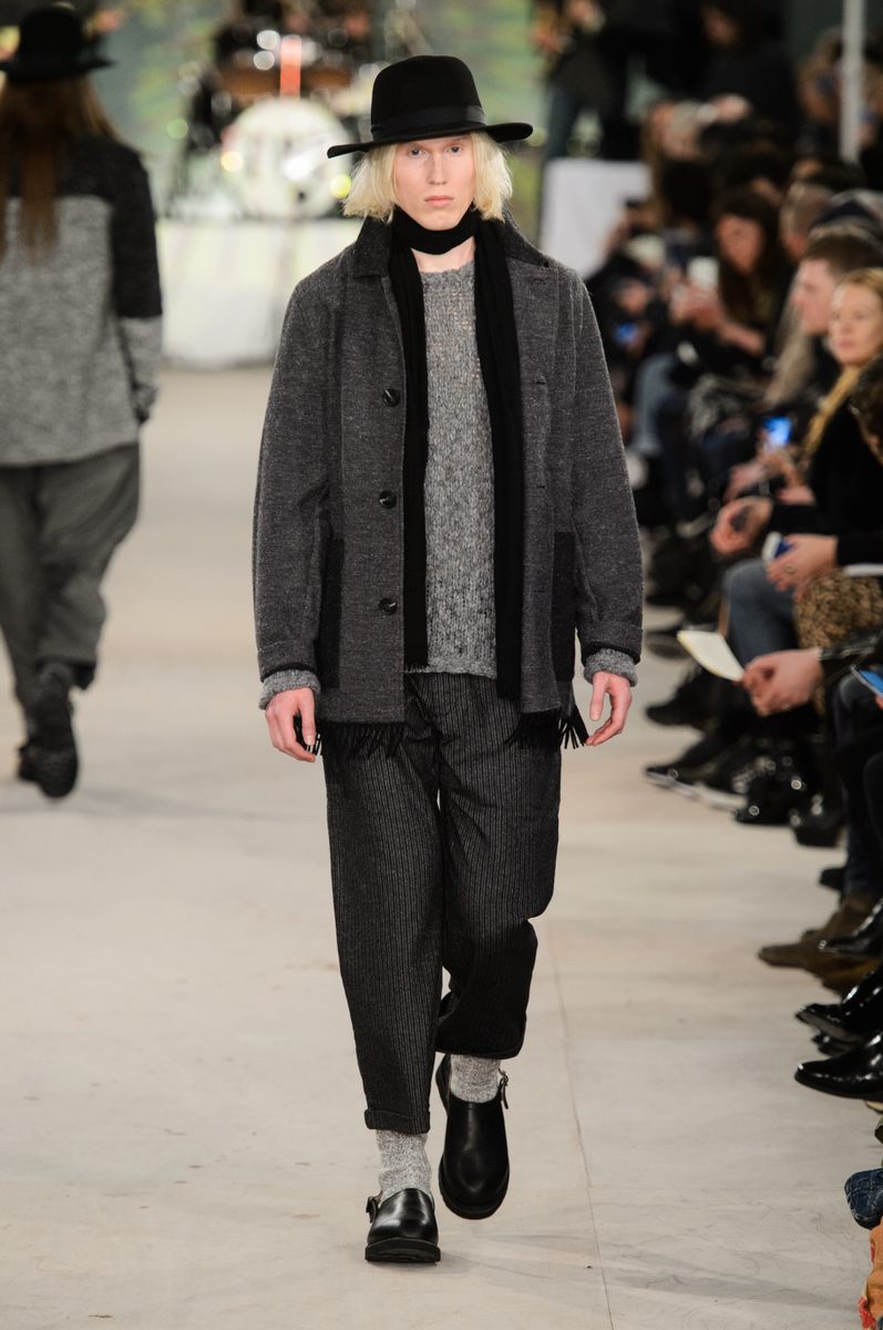 YMC went the way of the musician for its fall-winter 2016 men’s collection. Presented during London Collections: Men, the brand celebrated its 20 year anniversary with a stylish nod to 1960s British folk music with a bohemian flair. Dressed in dark hues, the range came with its fair share of ponchos, patched ripped jeans, leather jackets and knitwear featuring tonal prints. Embracing a slouchy silhouette, the man of YMC finished his artsy look with medium-length coats, light scarves, leather boots and wide-brimmed hats.