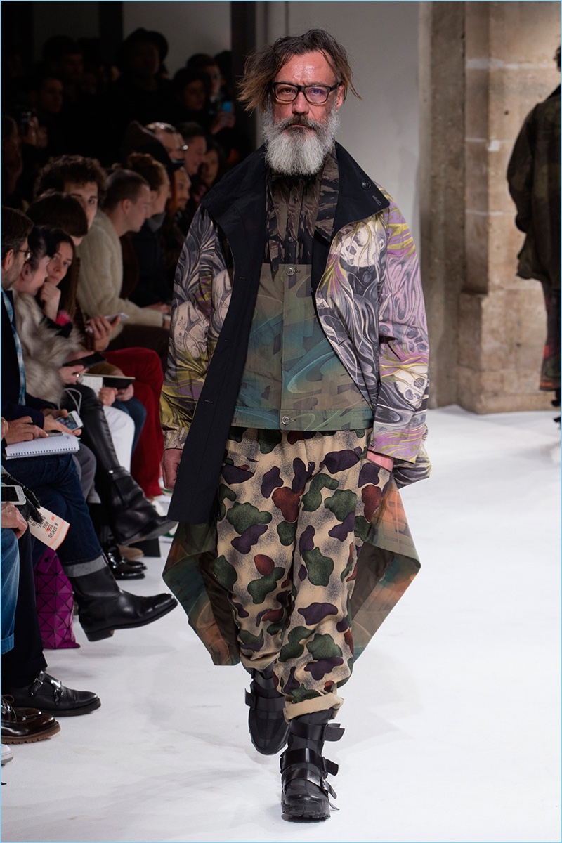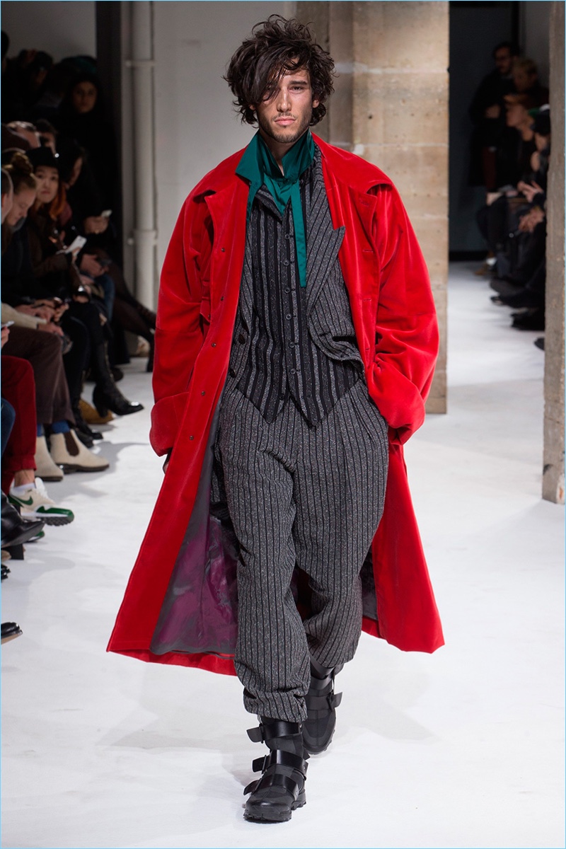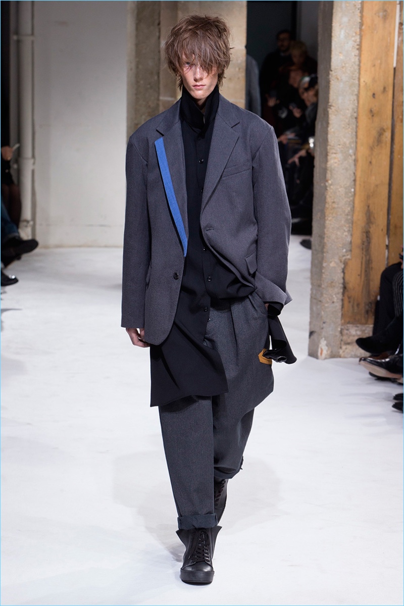 Yohji Yamamoto looked to the working man as muse for his fall-winter 2017 men’s collection. The Japanese designer sent a parade of soot covered models down the catwalk. Yamamoto’s intriguing man donned relaxed and elongated silhouettes. Skillfully layering, tunics, plunging waistcoats, and tapered trousers contributed to Yamamoto’s uniform. Meanwhile, oversized coats and blazers completed ready to replicate looks. Offering different classes within the ranks, the collection delivered everything from dusty hues and intricate prints to somber black.