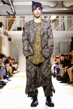Yohji Yamamoto Spring/Summer 2015–Yohji Yamamoto’s spring/summer 2015 collection read like a rich bazaar. Deep hues and intricate prints dressed oversized coats and trousers. Draped shawls and cardigans gave a nomadic vibe to the collection, which also featured suits with patches to imitate torn fabric. Yohji Yamamoto was also scrawled on pieces like street graffiti. Adopting denim and reinterpreting it for the cause, the blue classic was oversized and draped for some of the season’s most voluminous shapes. Rounding out the season were a relaxed lineup of suits with genius brush strokes.