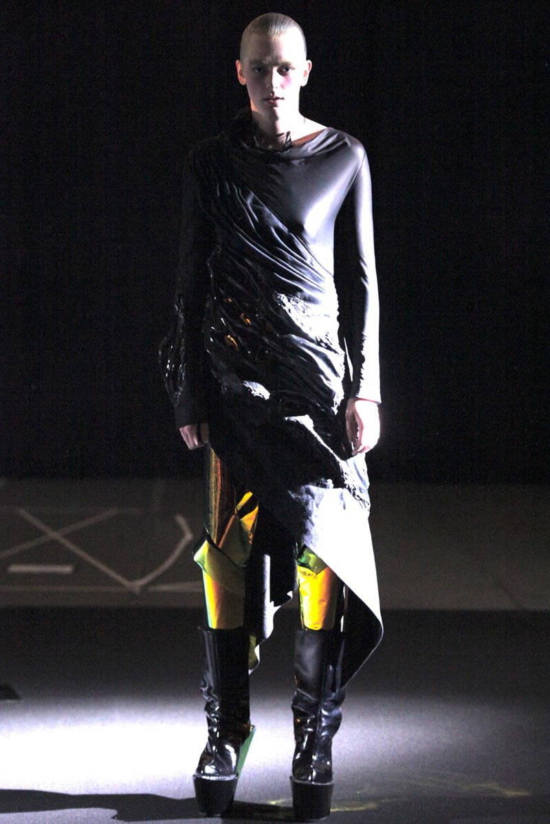 looking far into the future, where every element such as gender, culture, nature and human, machine or animal and human would be borderless, the collection explores symbolic items borrowed from womenswear such as corsets, dresses and skirts, along with impressive glam rock platform boots …