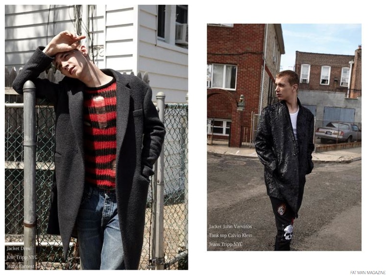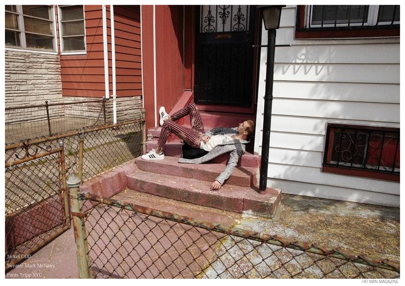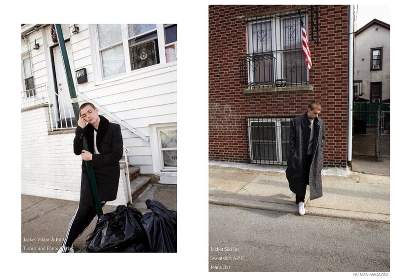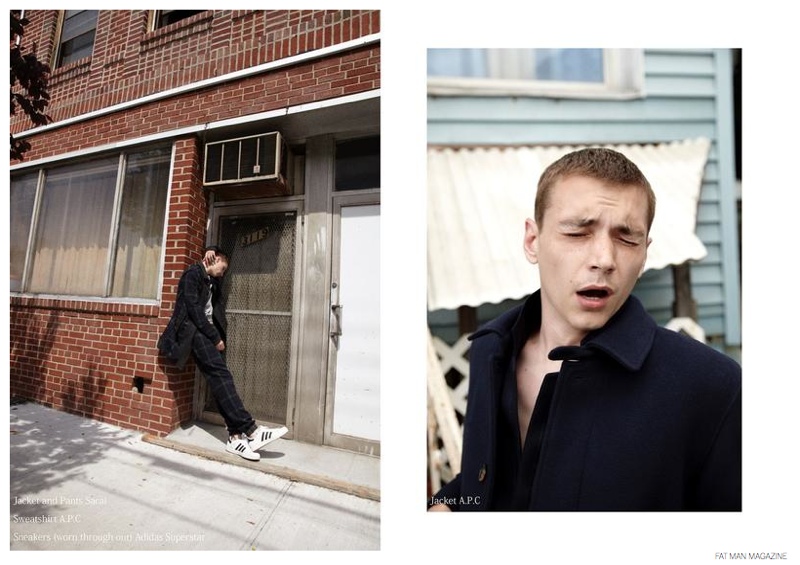 A Little Rough Around the Edges-Photographed by Jesper Damsgaard Lund, model Yuri Pleskun appears in a fashion spread for the August issue of Fat Man magazine. Offering a nonchalant look at fall garments, Yuri is styled by Kevin Hunter. Captured outdoors, Yuri wears suiting and outerwear, showcasing accessible garments and accessories from brands that include A.P.C., Marc McNairy, Adidas Superstar and Viktor & Rolf.