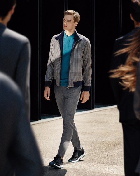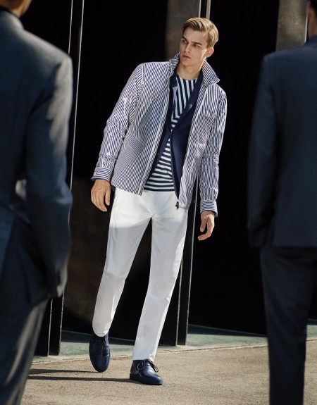 Z Zegna makes a nautical style proposal for spring. Navy and white fashions seamlessly come together with the brand’s signature sporty aesthetic. Featuring white sneakers front and center, a wardrobe of striped tees, sports jackets and shorts complement.