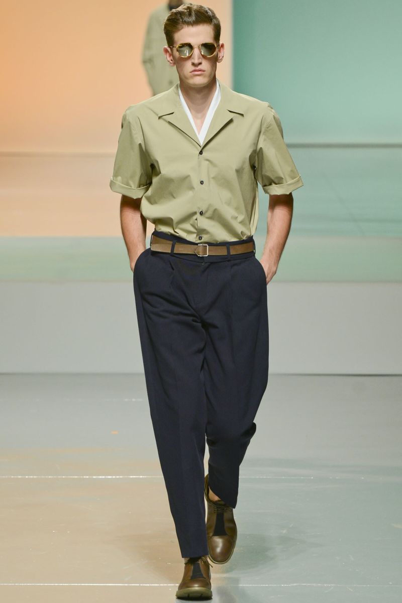 Solar Fashion–Bringing the military motif into the modern age, Z Zegna designer Paul Surridge looked to a new reflective material, created especially for the season. A sportswear treat, iridescent fabrics shimmered as the collection’s many pieces were reinterpreted in several forms. The suiting jacket came as a 3-button variation, double-breasted or fastened with four buttons and finished with halved shoulders. At the same time, elasticized baggy shorts were paired with a more casual version of the army shirt. A collection of loose slouchy silhouettes in neutral colors, Surridge recruited everything from high waist trousers and parkas to the field jacket for a striking outing of strong will.