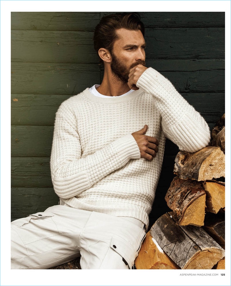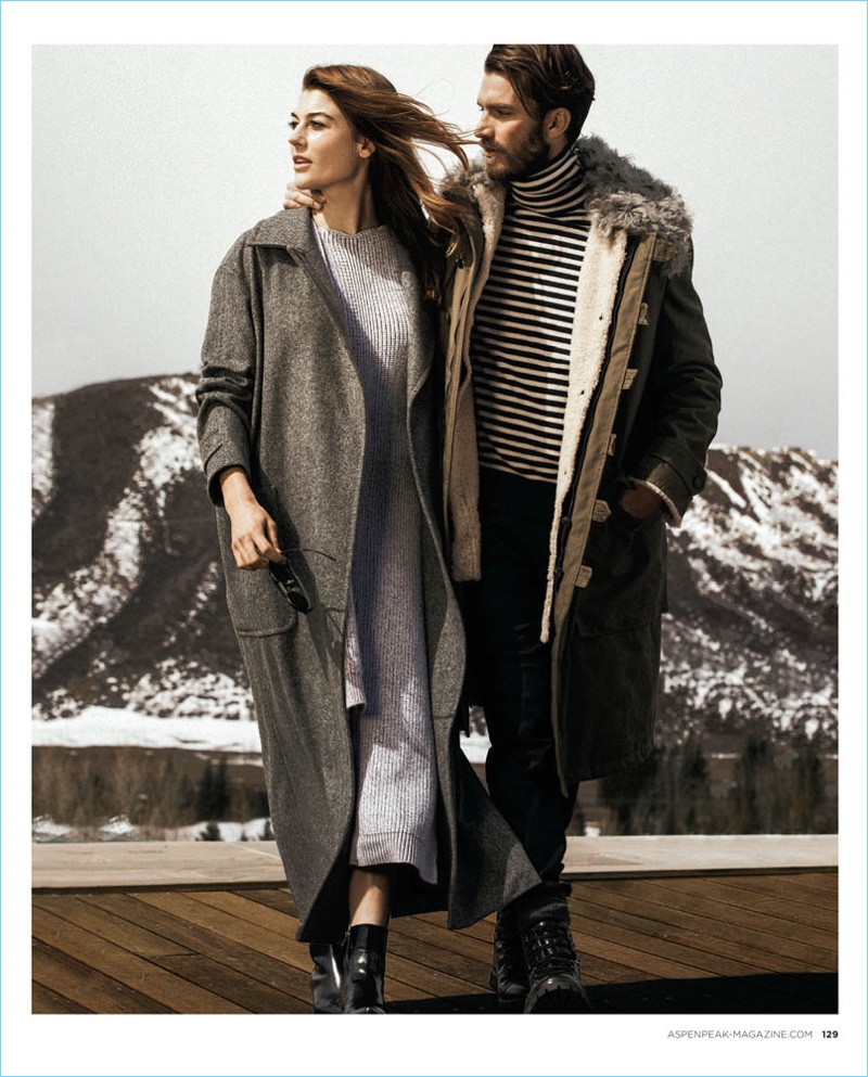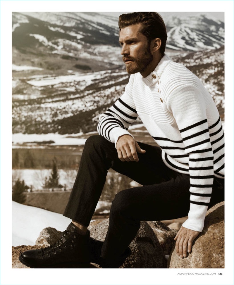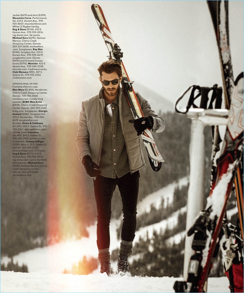 PinModels Zach Pricer and Alex Kate Knight couple up for an editorial in Aspen Peak.PinModel Zach Pricer dons a Tommy Hilfiger striped sweater with Burberry trousers, and Michael Kors hiking boots.PinRodolfo Martinez photographs Zach Pricer and Alex Kate Knight for Aspen Peak.PinTaking to the slopes, Zach Pricer wears a Mountain Force jacket and shirt with a Rag & Bone henley. The model also dons Ray-Ban sunglasses, Michael Kors ski pants, and Club Monaco cashmere socks.