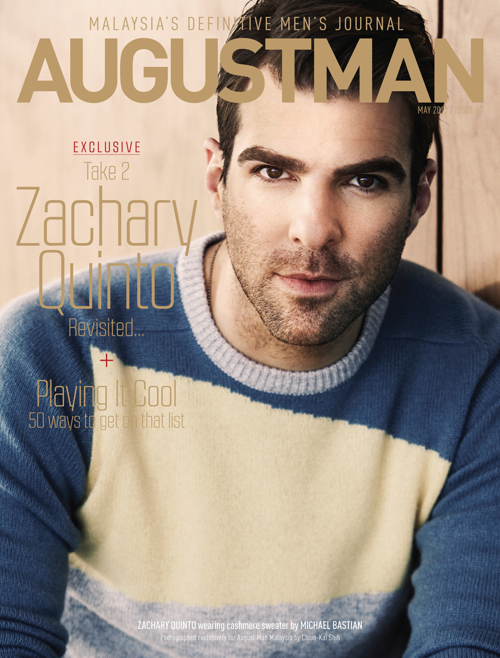 Triple Vision–Star Trek actor Zachary Quinto, appears in August Man Malaysia’s latest issue, captured by the lens of Chiun-Kai Shih. Gracing the magazine’s iPad edition cover, Zachary appears in three different images, all styled by Marcus Teo. Sporting Michael Bastian’s striped cashmere sweaters, Thom Browne’s formal two-piece suits or Todd Snyder’s casual cashmere sweatshirts, Zachary completes his look with timeless Piaget watches, proving that there’s always time in our lives to be fashionable. / Photography assistance by Alex Muccilli. Styling assistance by Nick Whitehouse. Grooming by Assumpta Clohessey. Post production by Skin Digital Retouching.