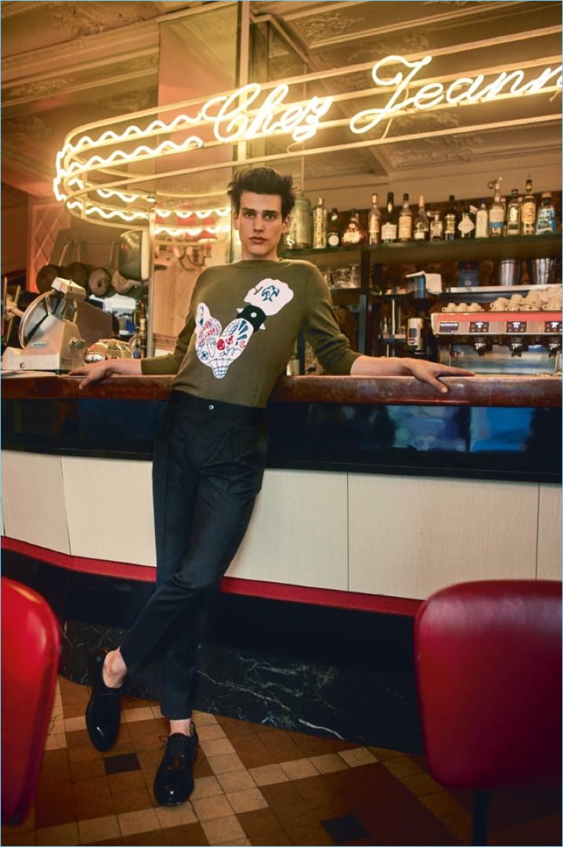 Appearing in a black and white photo, Simon van Meervenne wears a ‘RUSH’ sweater with cropped trousers by Zadig & Voltaire.