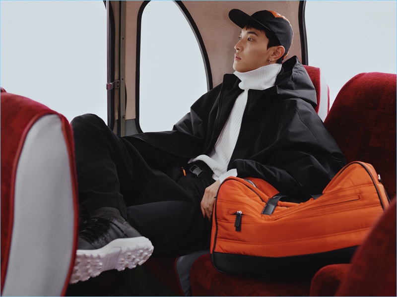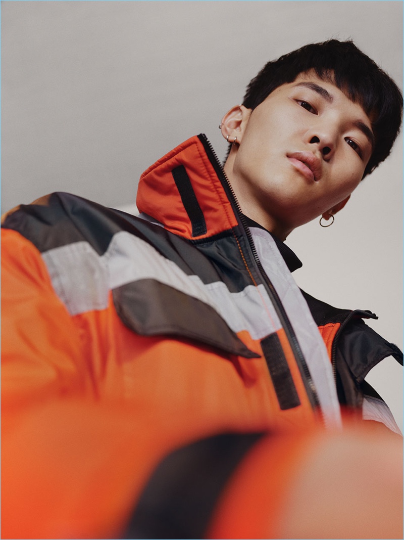 Korean model Jeon June rocks an orange and black jacket from Zara Man.