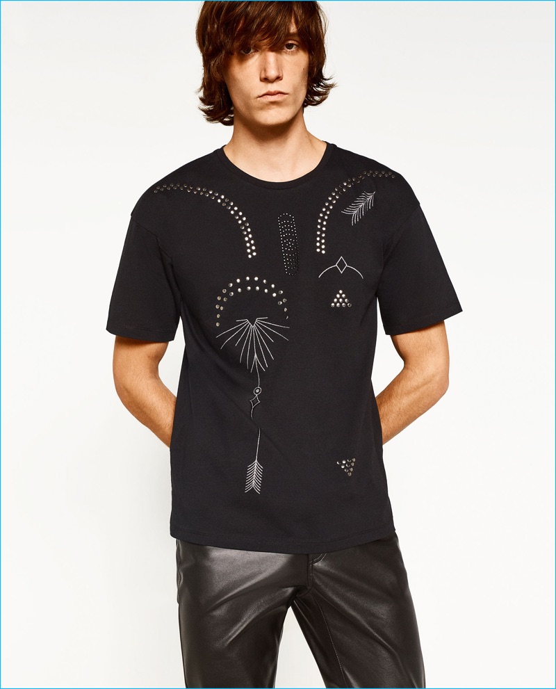 Zara Man cozies up to black fashions for its most recent edit. The Spanish brand enlists model Joep Van de Sande to sport essentials from its Boho LA collection. The on-trend lineup brings to mind designer Hedi Slimane’s final collection for Saint Laurent. Zara’s collection includes an indie rock vibe that brings together slim silhouettes with a western cool. Here, black reigns with a range of embellished shirts, narrow trousers, tailored coats, and choice accessories.
