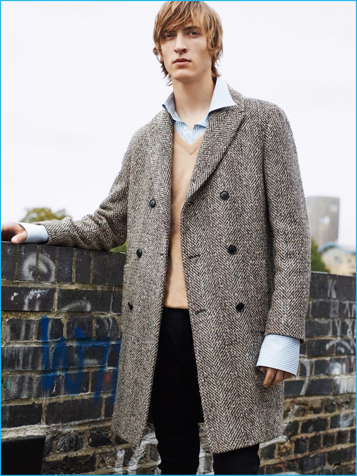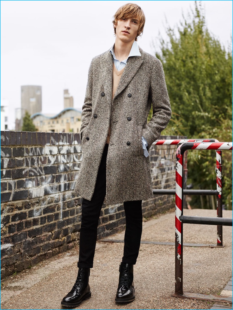 PinTim Dibble dons a double-breasted herringbone coat with a cashmere sweater, striped shirt, black jeans, and boots by Zara Man.