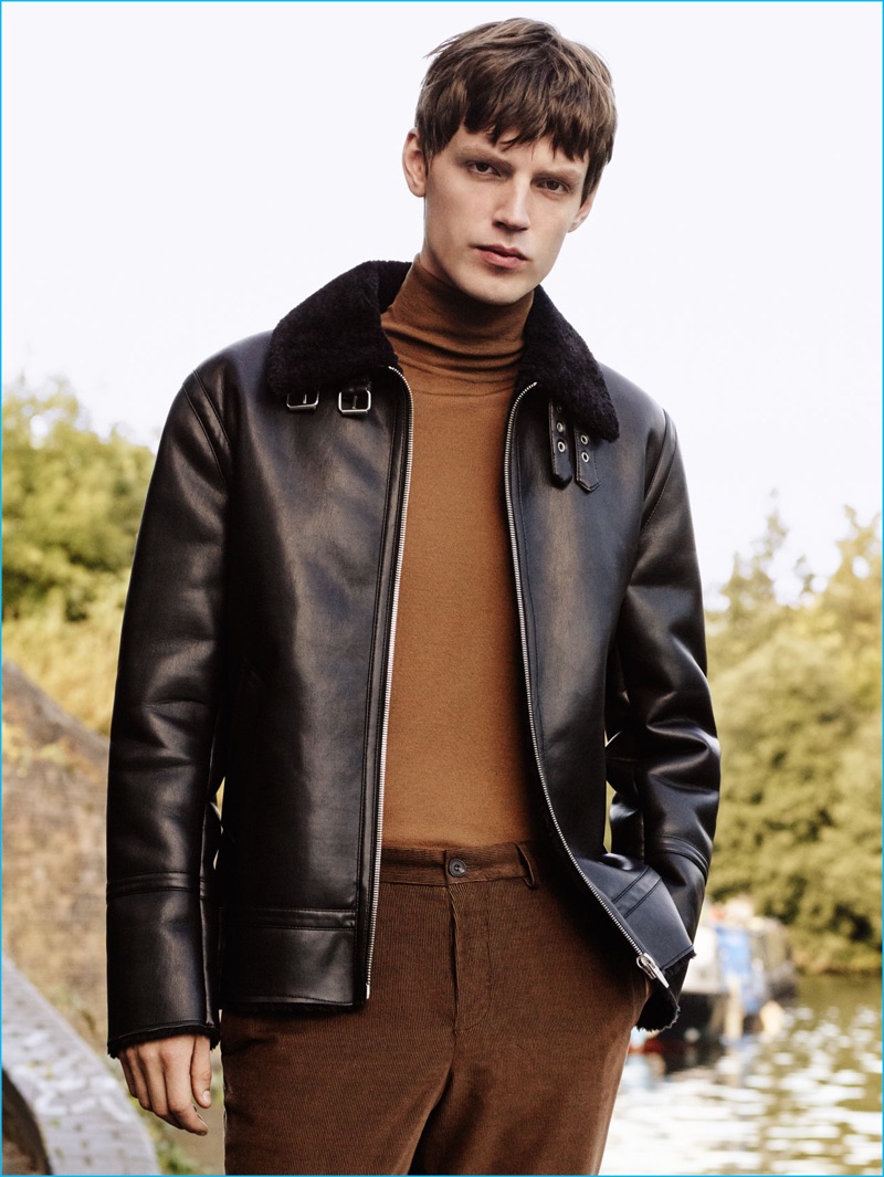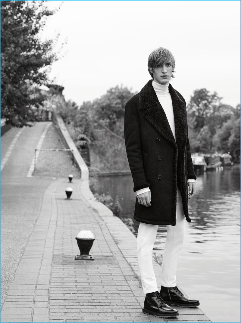 PinCallum Ward sports a single-breasted coat with a cashmere sweater, faux leather pants, and bluchers from Zara Man.PinLeft to Right: Callum Ward wears a herringbone coat with a check sweater. Tim Dibble sports a double-faced coat with a turtleneck sweater by Zara Man.PinModel Tim Dibble wears an oversized parka, printed shirt, technical suit trousers, and black boots from Zara Man.PinEnglish model Callum Ward sports a faux leather jacket with a turtleneck and corduroy pants from Zara Man.PinConnecting with Zara Man, Tim Dibble steps out in a double-faced coat with a turtleneck sweater, straight-fit jeans, and black boots.