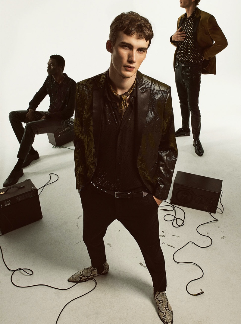 Zara proposes a rock-inspired wardrobe to enjoy the nightlife with its latest editorial. The Spanish brand taps models Valentin Caron, Peter Dupont, Lukas Adriaensens, Cherif Douamba, and Ambroise Mendy to front the outing. Traveling to Madrid, the models hit the studio in fresh new styles. Zara’s selection includes patterned shirts, faux fur jackets, and skinny jeans. Embracing a dark color palette, Zara brings contrast to must-have editorial looks with a splash of metallic accents.