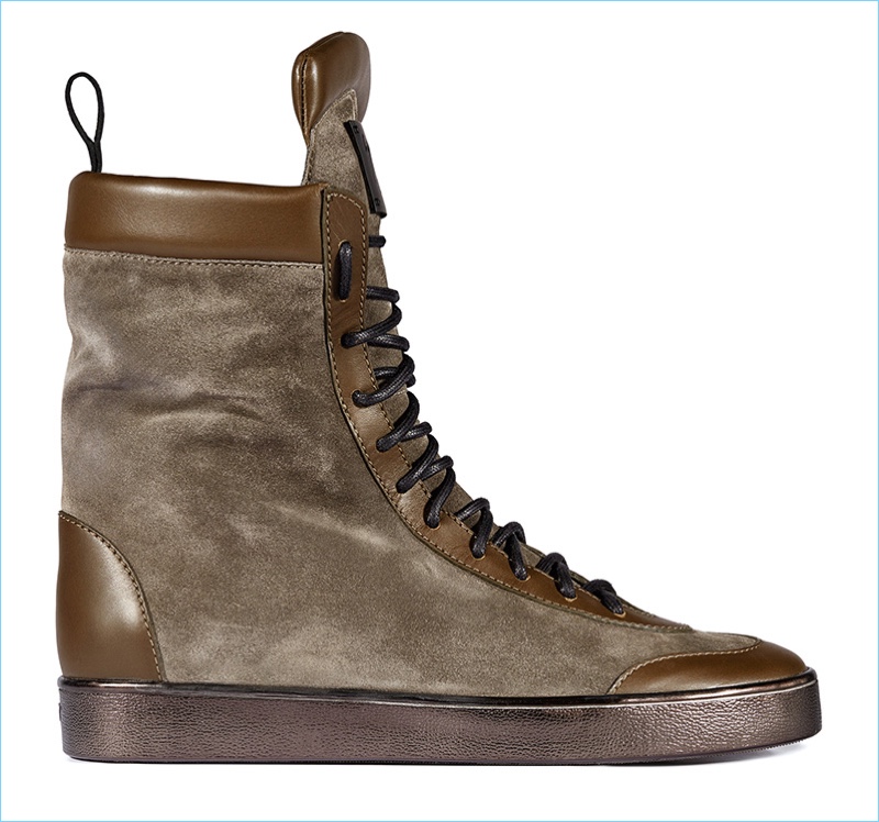 Take on the sneaker boot trend with Zayn Malik x Giuseppe Zanotti’s JAVAAD style: “Inspired by classic boxing designs, a streamlined lace-up sneaker boot crafted in gray-brown suede and trimmed in chocolate leather.”