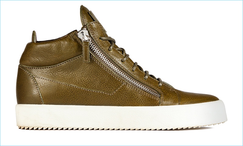 Upgrade your casual style with Zayn Malik x Giuseppe Zanotti ‘s TAZ sneakers: “A mid-top sneaker in olive green leather with lateral zips and a white contrasting sole.”